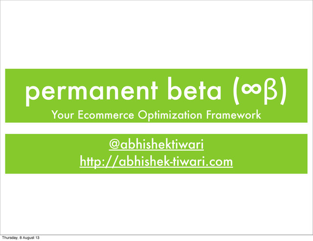 with business objectives (ATV, Conversion, Recovery) • Identify business objective funnel • Generate test hypothesis • Plan, create and run experiment • Analyze results, rinse and repeat Thursday, 8 August 13