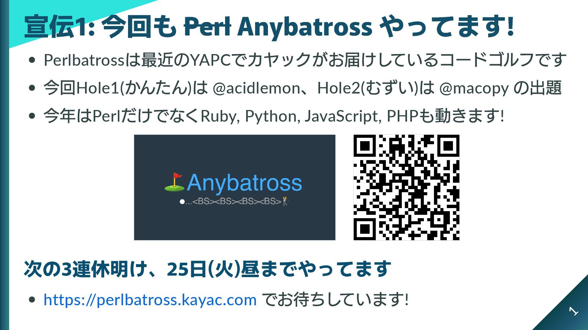 @macopy の出題 今年はPerl だけでなくRuby, Python, JavaScript, PHP も動きます! 次の3連休明け、25日(火)昼までやってます https:/ /perlbatross.kayac.com でお待ちしています! 宣伝1: 今回も Perl Anybatross やってます! 1
