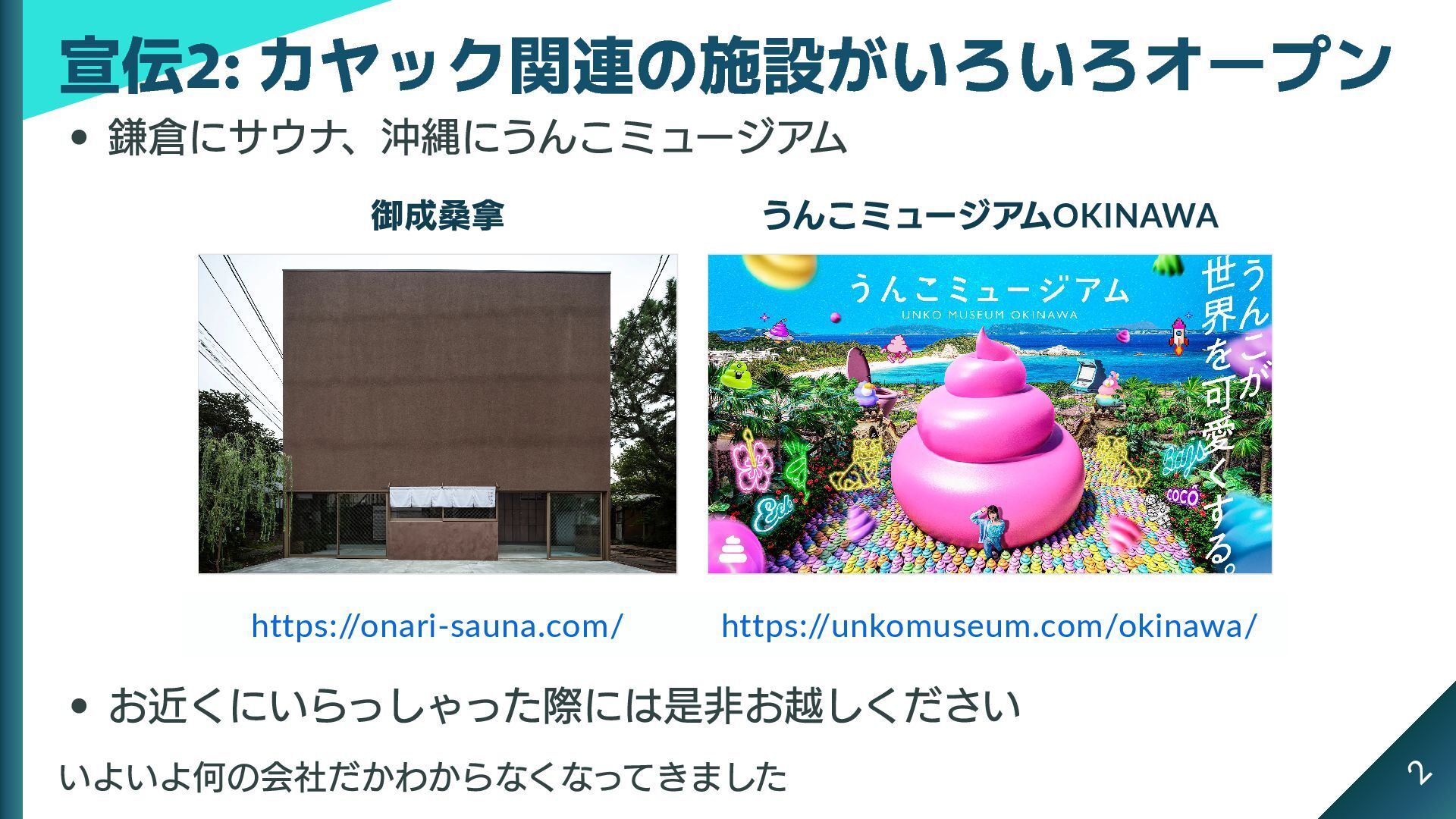 鎌倉にサウナ、沖縄にうんこミュージアム 御成桑拿 うんこミュージアムOKINAWA https:/ /onari-sauna.com/ https:/ /unkomuseum.com/okinawa/ お近くにいらっしゃった際には是非お越しください いよいよ何の会社だかわからなくなってきました 宣伝2: