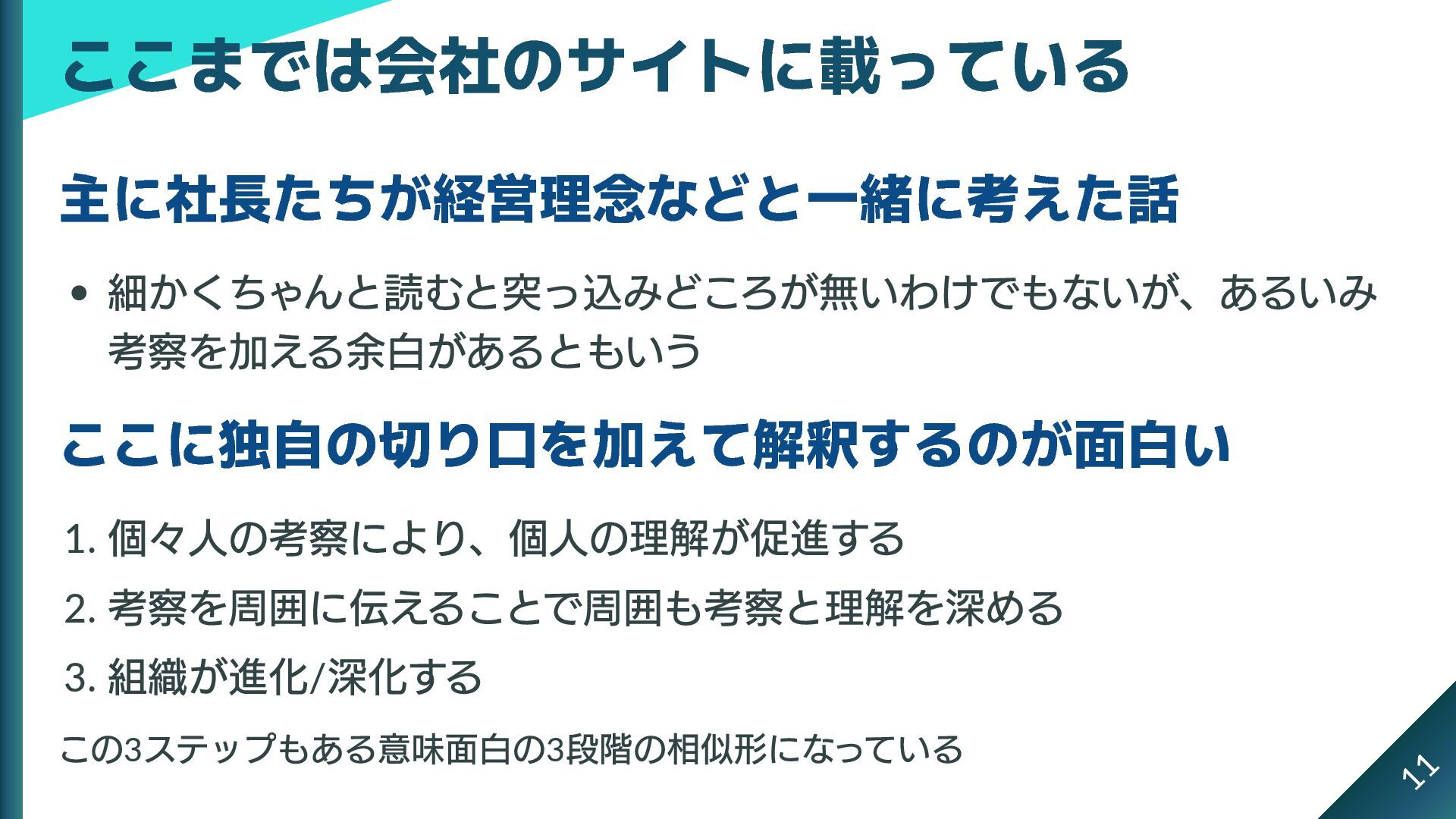 深化する この3 ステップもある意味面白の3 段階の相似形になっている ここまでは会社のサイトに載っている 11