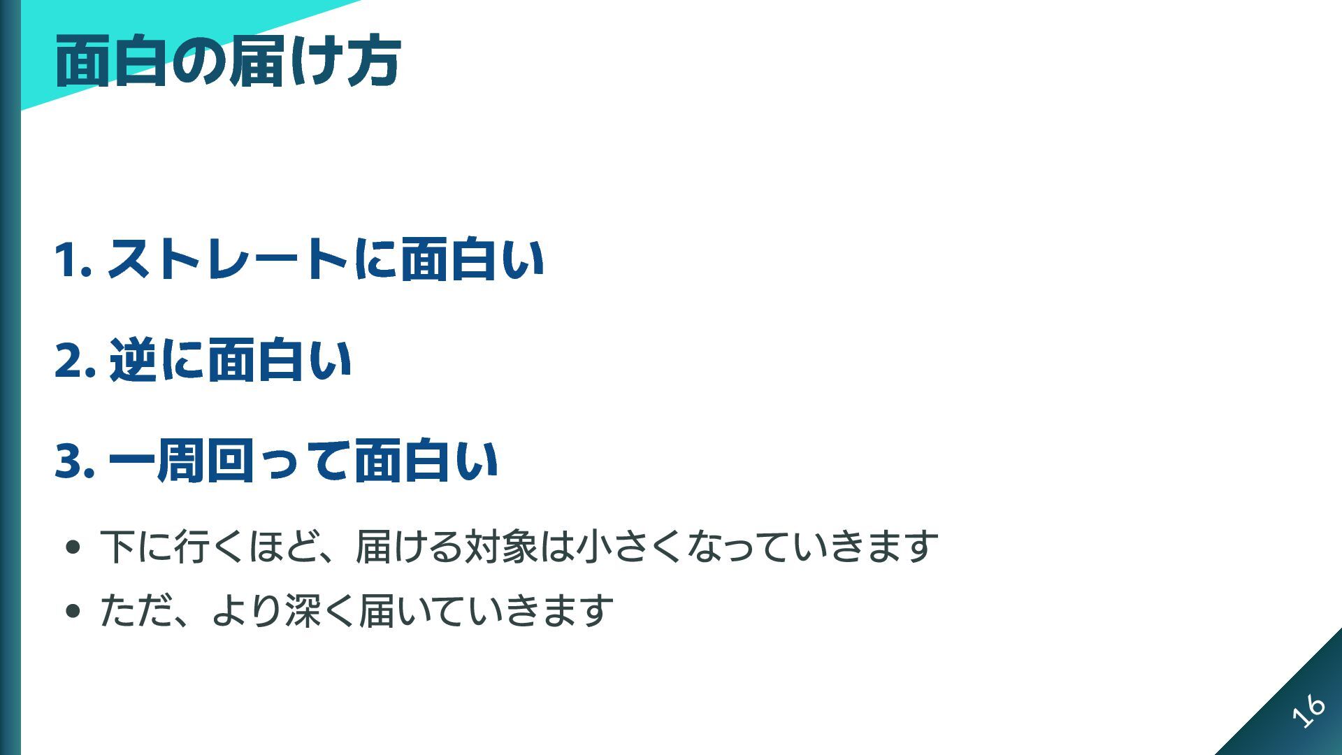 1. ストレートに面白い 2. 逆に面白い 3. 一周回って面白い 下に行くほど、届ける対象は小さくなっていきます ただ、より深く届いていきます 面白の届け方 16