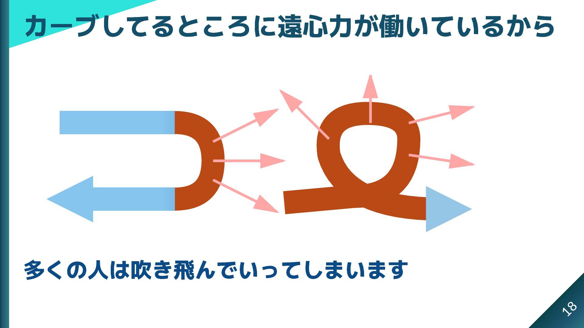 多くの人は吹き飛んでいってしまいます カーブしてるところに遠心力が働いているから 18