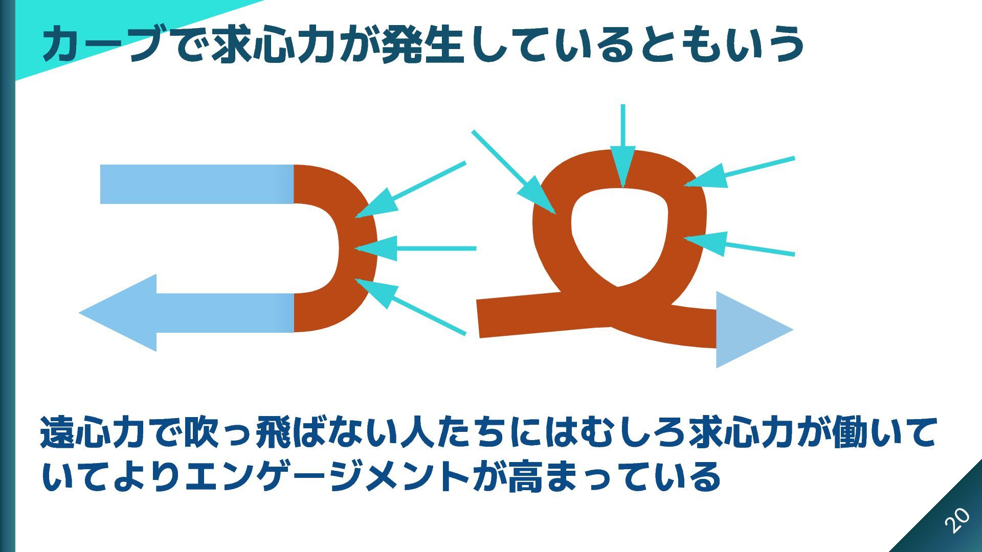遠心力で吹っ飛ばない人たちにはむしろ求心力が働いて いてよりエンゲージメントが高まっている カーブで求心力が発生しているともいう 20