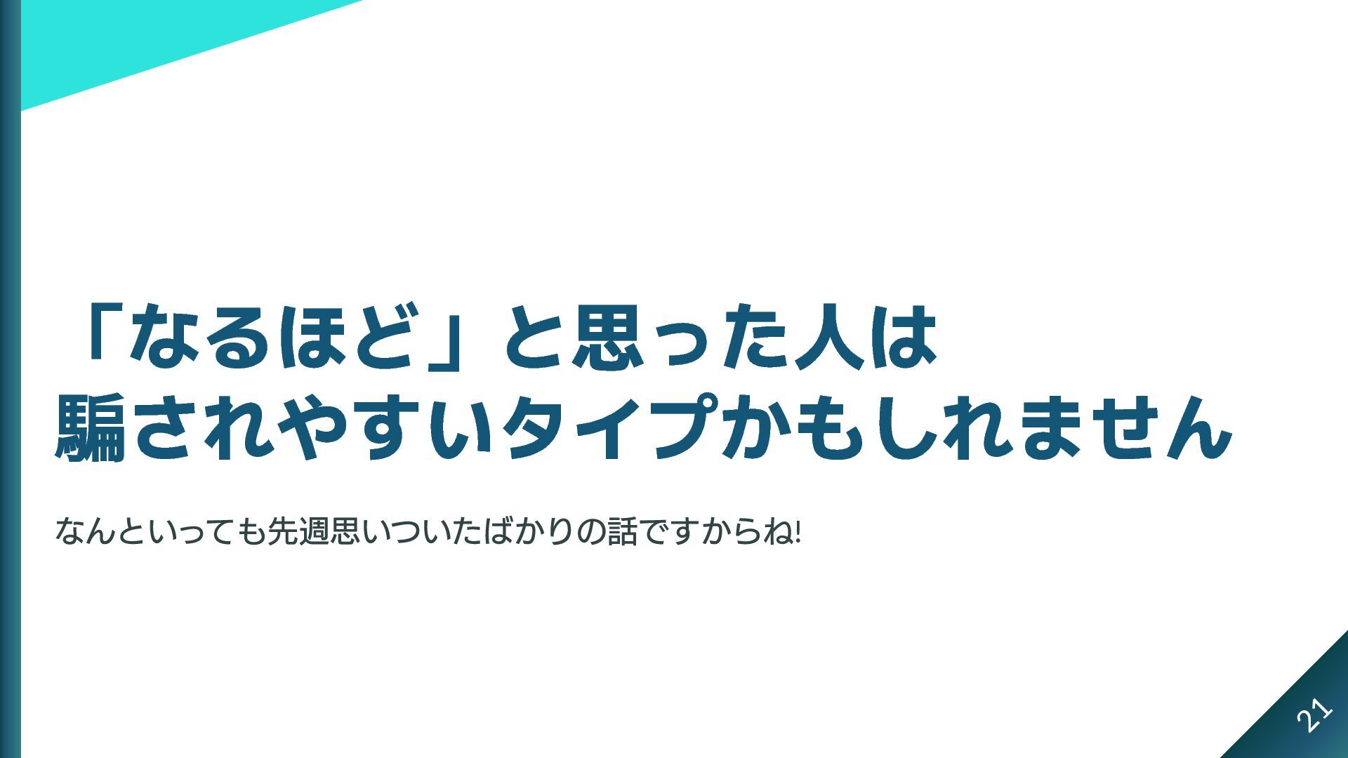 「なるほど」と思った人は 騙されやすいタイプかもしれません なんといっても先週思いついたばかりの話ですからね! 21