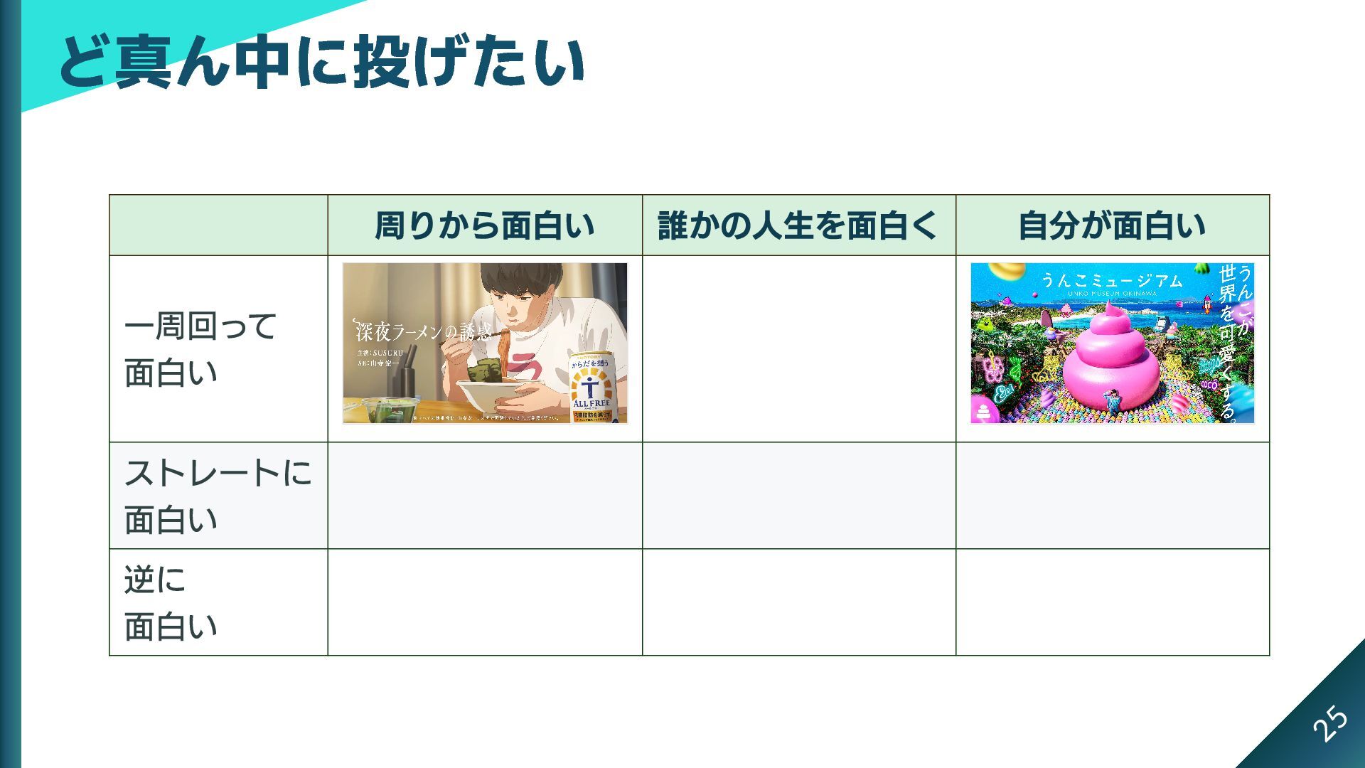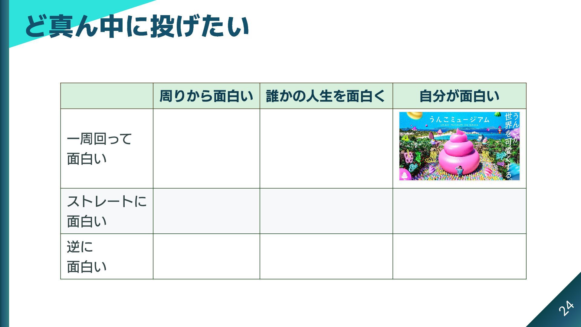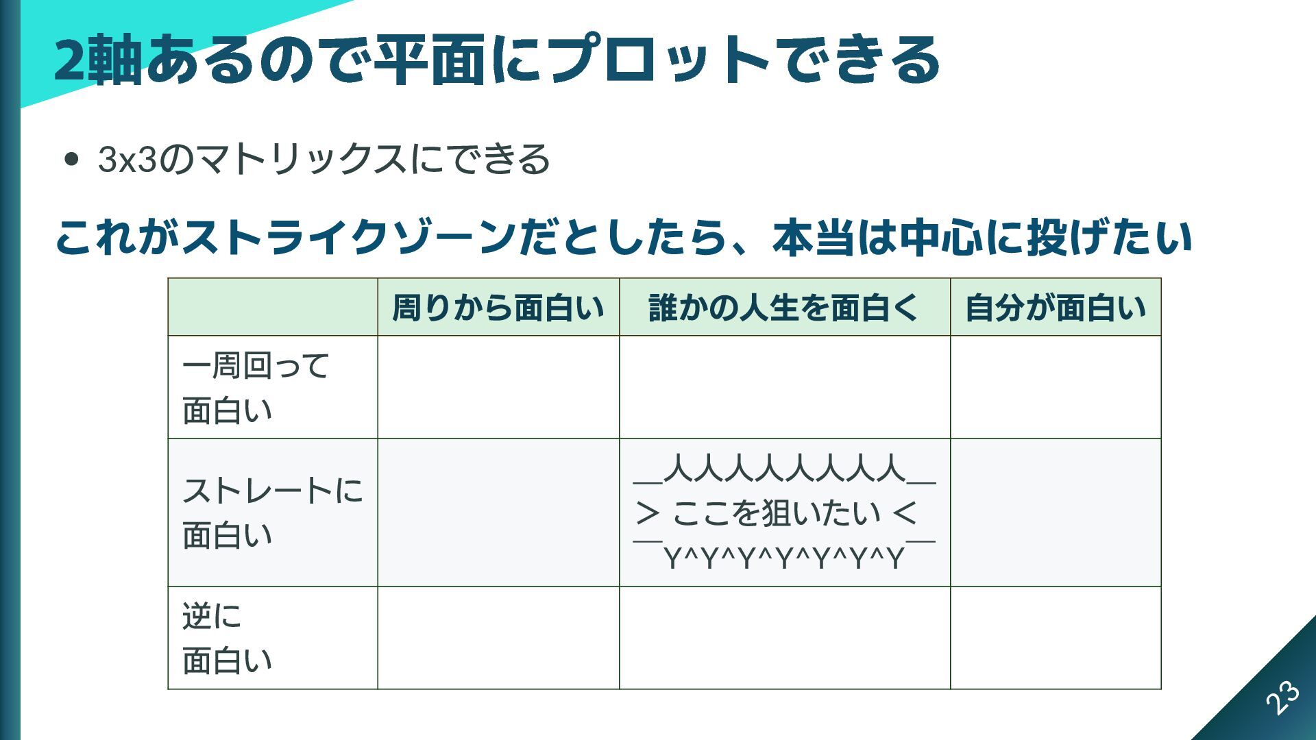 3x3 のマトリックスにできる これがストライクゾーンだとしたら、本当は中心に投げたい 周りから面白い 誰かの人生を面白く 自分が面白い 一周回って 面白い ストレートに 面白い