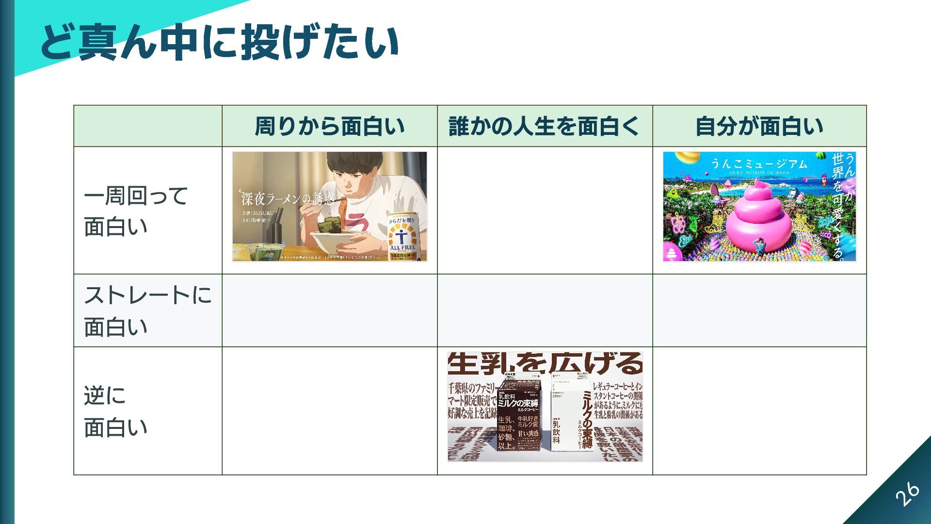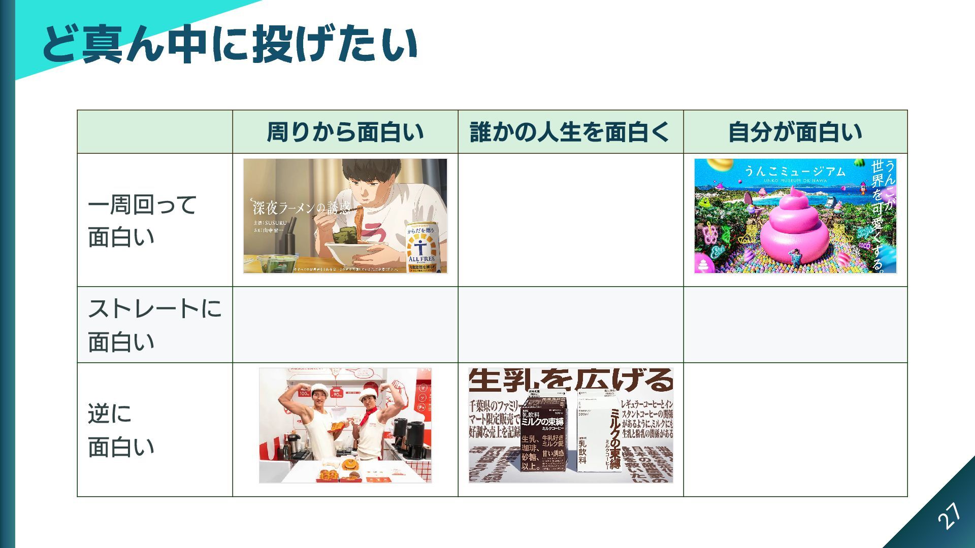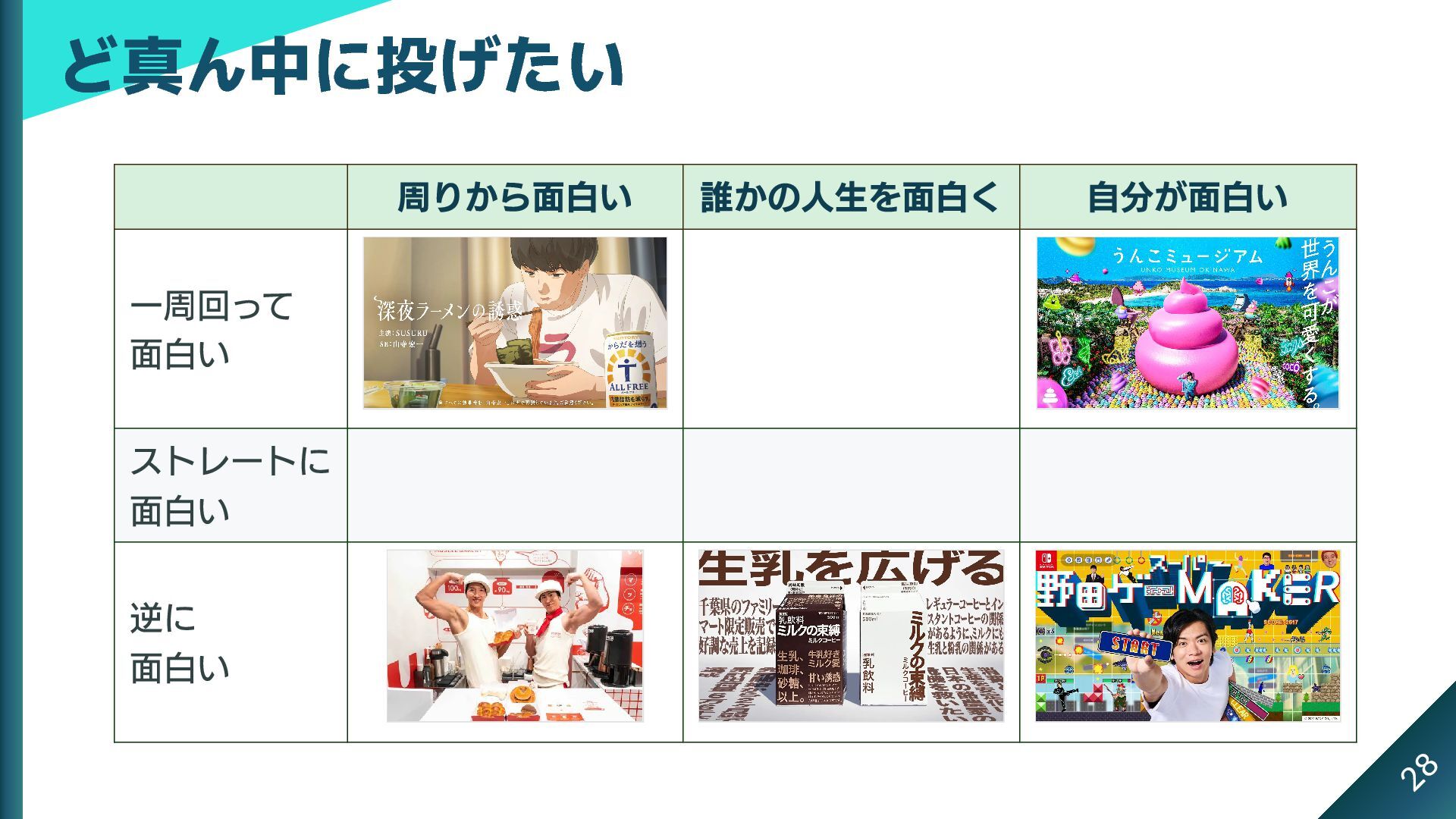 3x3 のマトリックスにできる これがストライクゾーンだとしたら、本当は中心に投げたい 周りから面白い 誰かの人生を面白く 自分が面白い 一周回って 面白い ストレートに 面白い