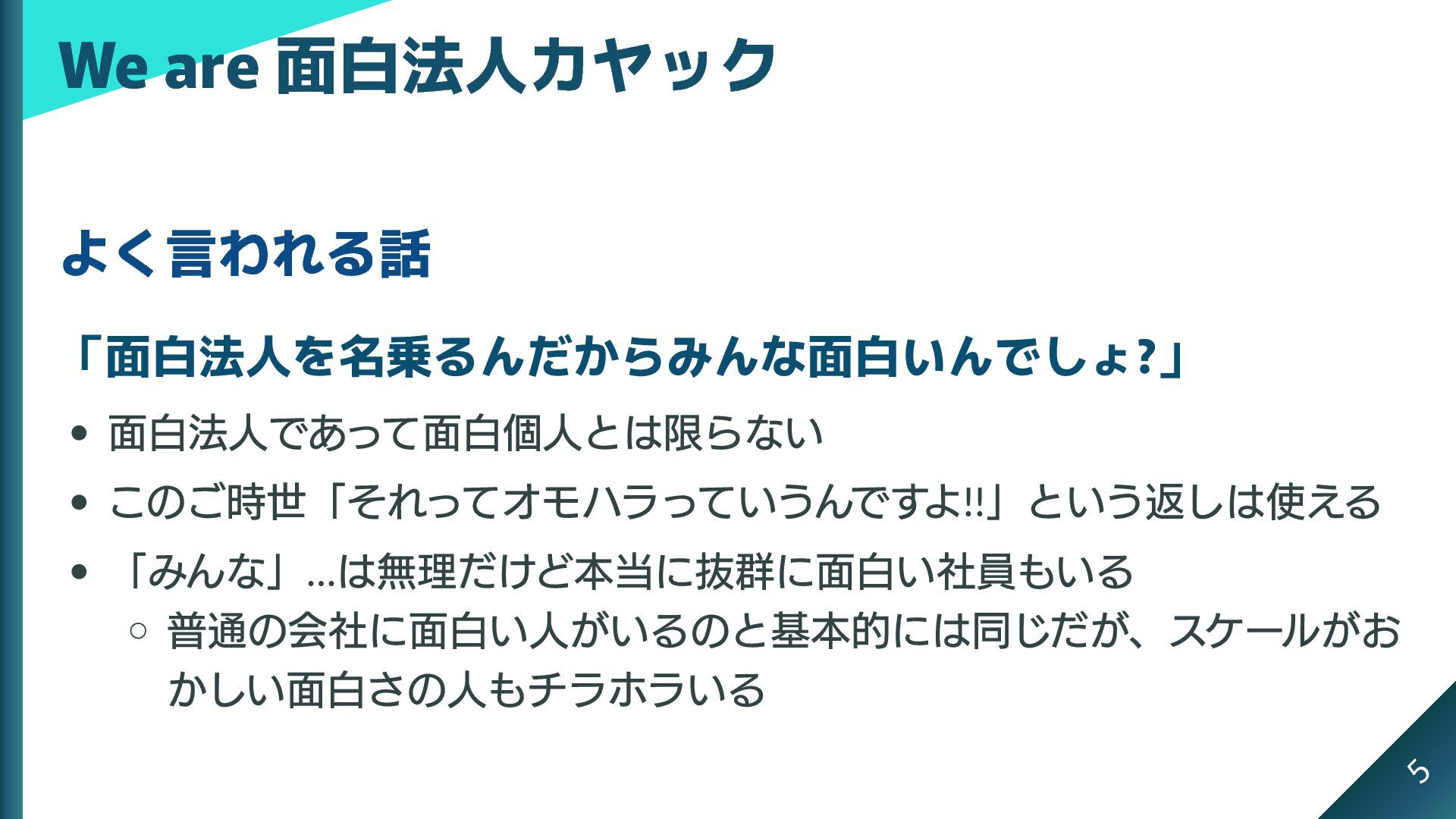 よく言われる話 「面白法人を名乗るんだからみんな面白いんでしょ?」 面白法人であって面白個人とは限らない このご時世「それってオモハラっていうんですよ!! 」という返しは使える 「みんな」… は無理だけど本当に抜群に面白い社員もいる 普通の会社に面白い人がいるのと基本的には同じだが、スケールがお かしい面白さの人もチラホラいる We