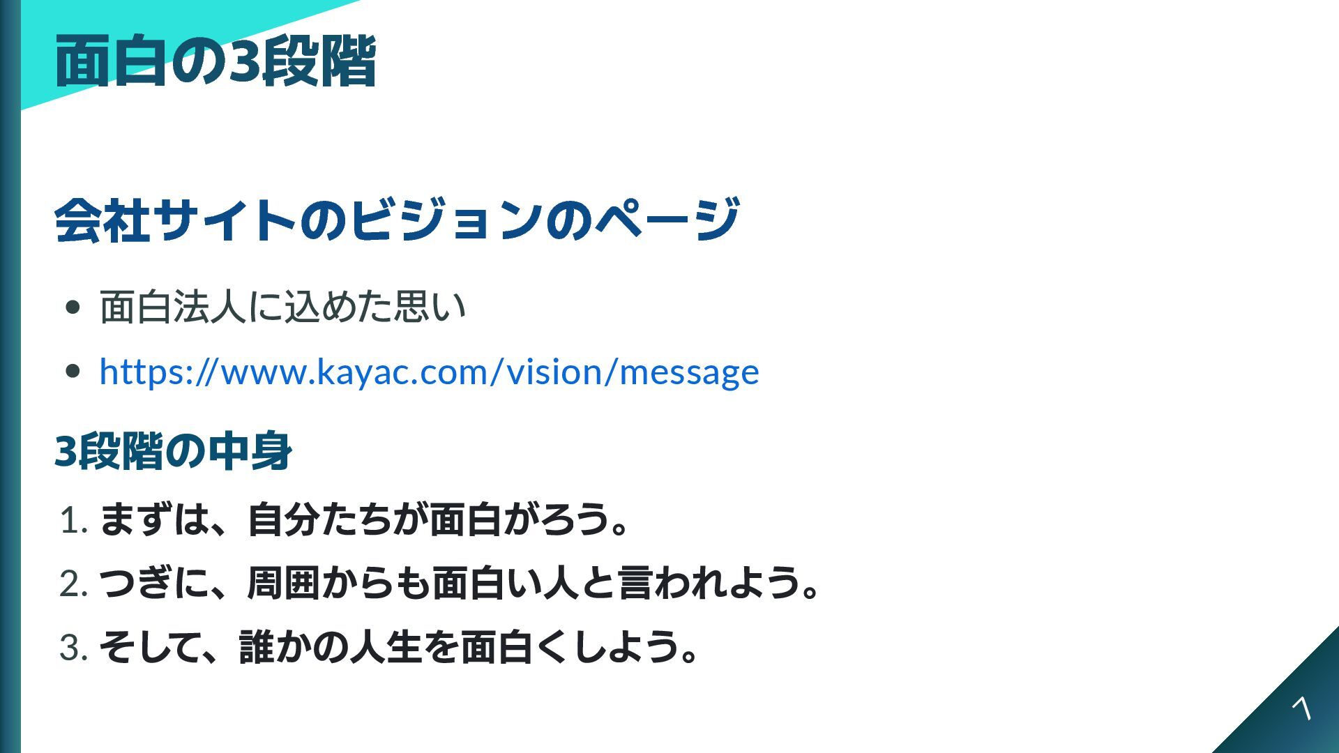 会社サイトのビジョンのページ 面白法人に込めた思い https:/ /www.kayac.com/vision/message 3段階の中身 1. まずは、自分たちが面白がろう。 2. つぎに、周囲からも面白い人と言われよう。 3.