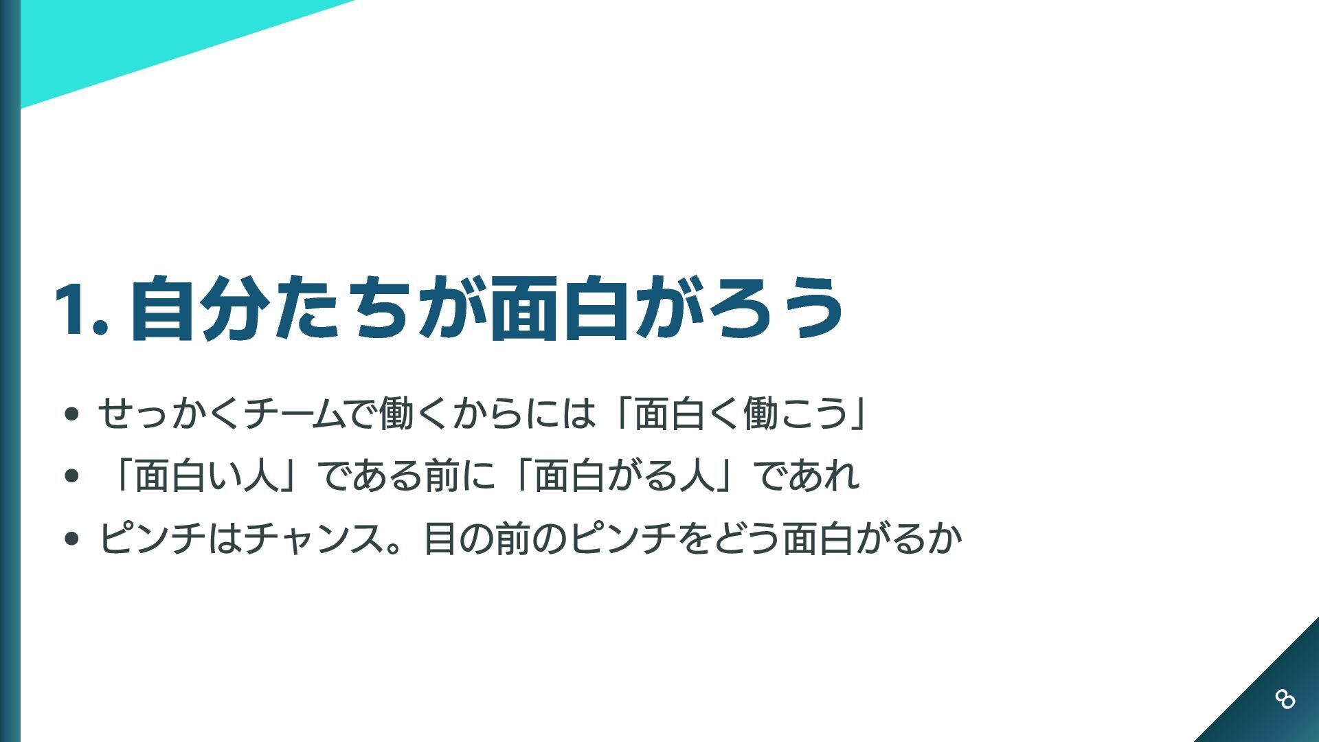 1. 自分たちが面白がろう せっかくチームで働くからには「面白く働こう」 「面白い人」である前に「面白がる人」であれ ピンチはチャンス。目の前のピンチをどう面白がるか 8