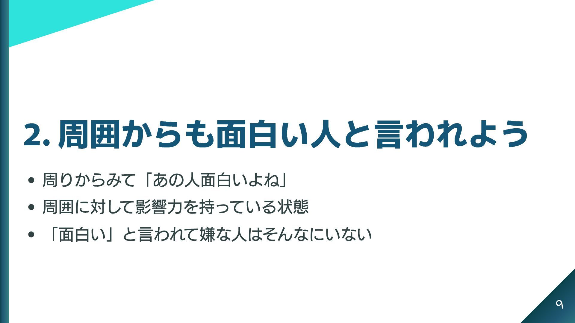 2. 周囲からも面白い人と言われよう 周りからみて「あの人面白いよね」 周囲に対して影響力を持っている状態 「面白い」と言われて嫌な人はそんなにいない 9