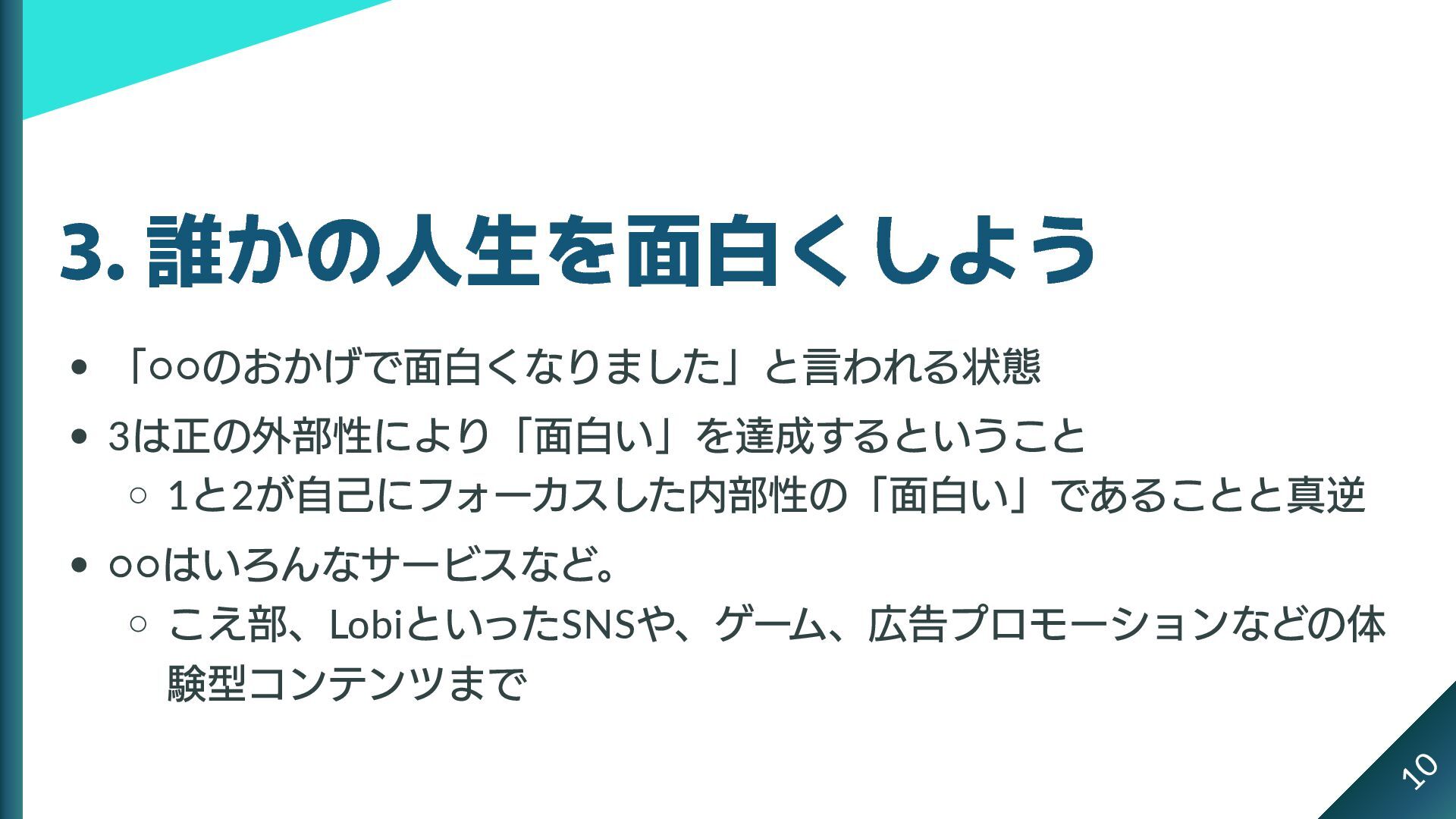 3. 誰かの人生を面白くしよう 「◦◦ のおかげで面白くなりました」と言われる状態 3 は正の外部性により「面白い」を達成するということ 1 と2 が自己にフォーカスした内部性の「面白い」であることと真逆 ◦◦