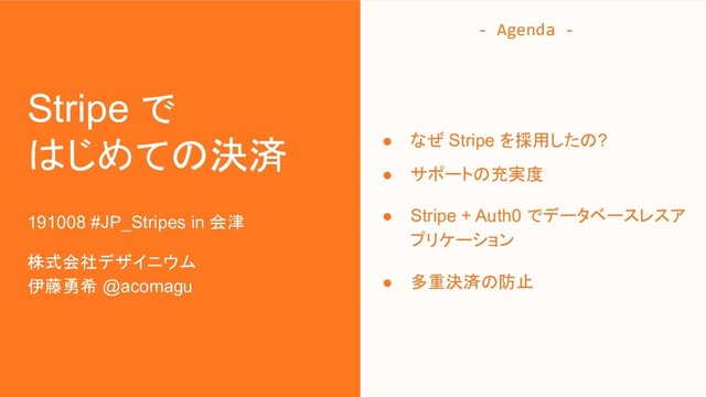 • なぜ Stripe を採用したの? • サポートの充実度 • Stripe + Auth0 でデータベースレスア プリケーション • 多重決済の防止 - Agenda -
