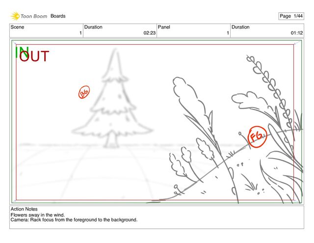 Scene 1 Duration 02:23 Panel 1 Duration 01:12 Action Notes