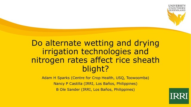 A/Prof Adam H Sparks leads the summer crop pathology research at USQ in the Centre for Crop Health, previously he worked with the International Rice Research Institute (IRRI) as a plant disease management specialist. Dr Nancy P Castilla works at the International Rice Research Institute (IRRI) as a researcher studying methods to control rice disease and offers training and support for capacity building for national partners. Dr Bjorn Ole Sander works at IRRI as a scientist in IRRI’s climate change research group with a focus on greenhouse gas (GHG) mitigation technologies, which include alternate wetting and drying.