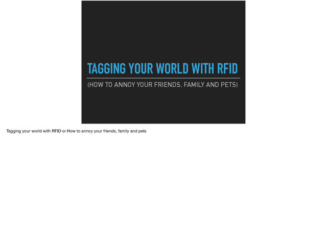 Come learn all the wonderful uses of UHF RFID tags and how Ruby makes it easy to read, write and deploy real time asset tracking systems. RFID tags can be read from 30 or more feet away and easily integrated with a variety of existing systems with a low barrier to entry. By the end of this session, you'll learn how to track your pets, clothes, keys, and even make a tool that assists with your grocery shopping.