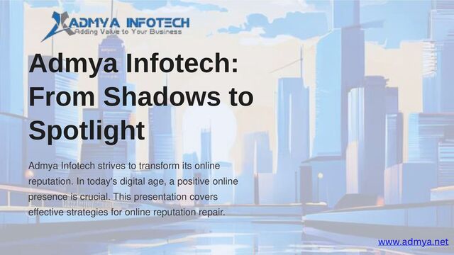 Admya Infotech specializes in providing robust online reputation management and brand management services. This PDF outlines our service offerings, strategies for negative content removal, social media reputation management, and more. Download it to learn how we can help you maintain a positive digital presence. Explore more at admya.net.