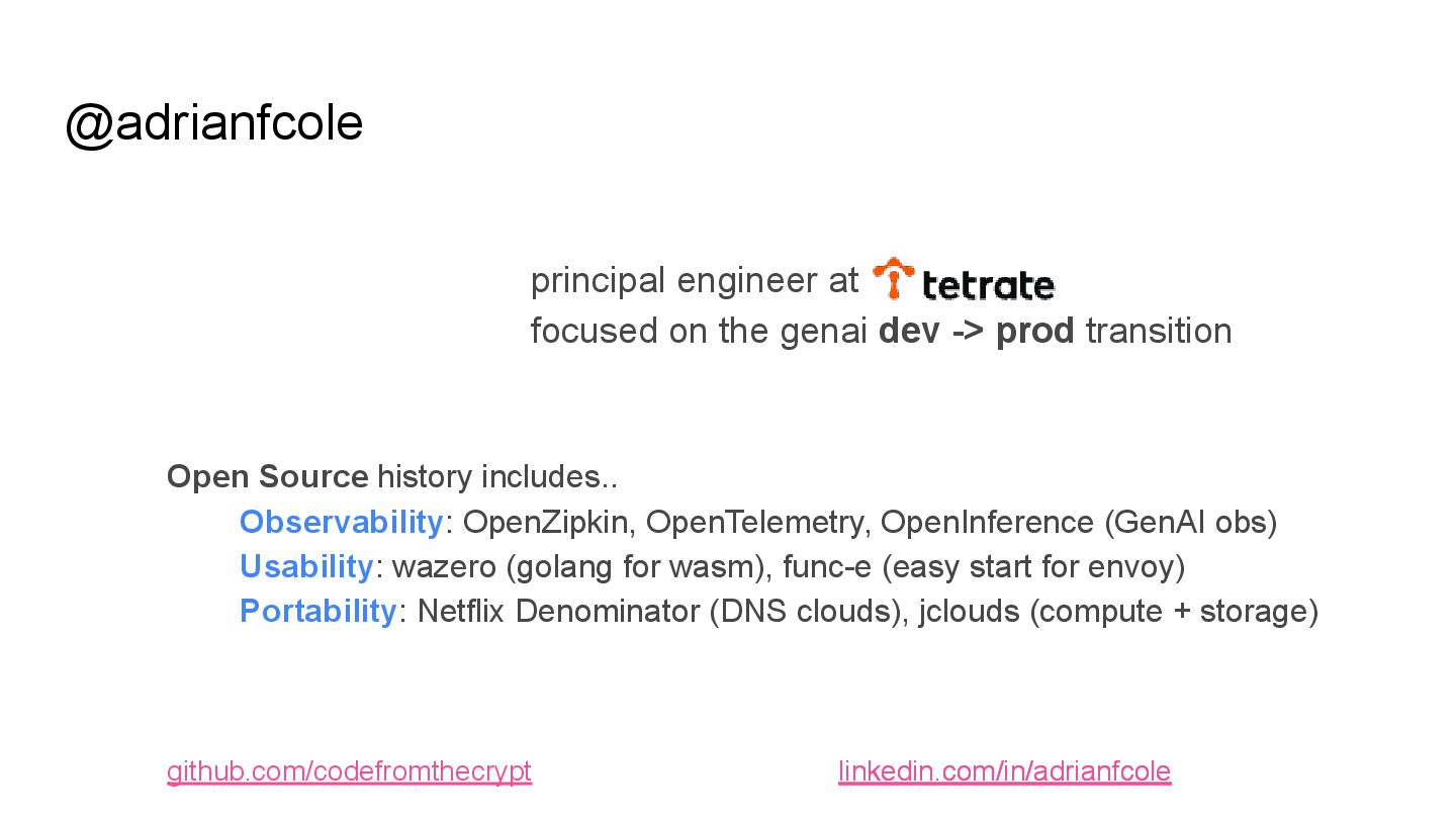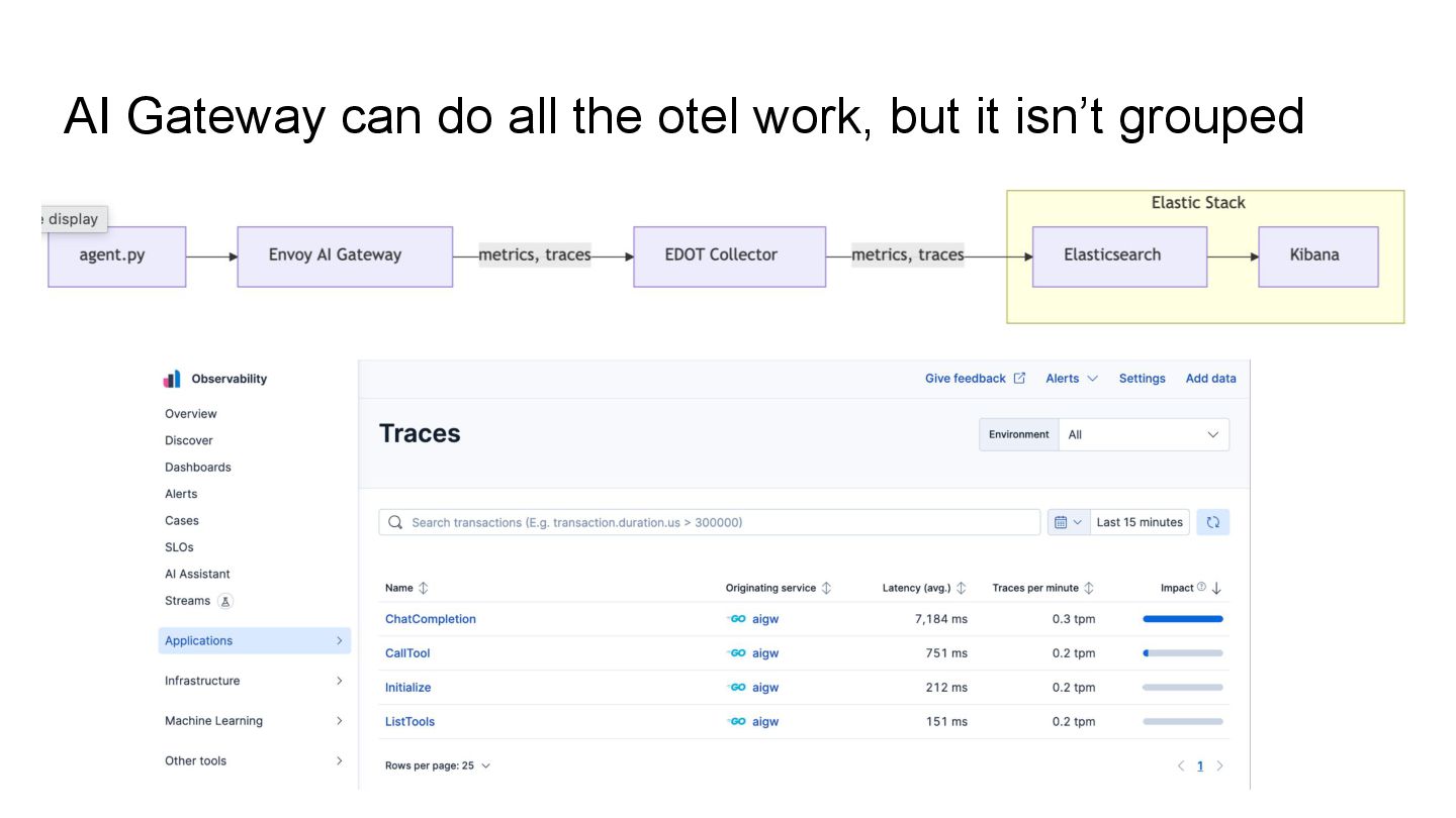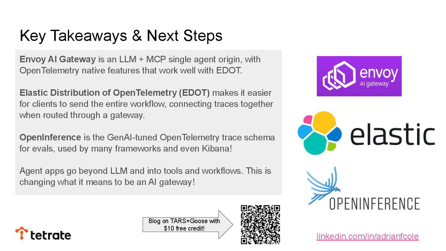 origin, with OpenTelemetry native features that work well with EDOT. Elastic Distribution of OpenTelemetry (EDOT) makes it easier for clients to send the entire workflow, connecting traces together when routed through a gateway. OpenInference is the GenAI-tuned OpenTelemetry trace schema for evals, used by many frameworks and even Kibana! Agent apps go beyond LLM and into tools and workflows. This is changing what it means to be an AI gateway! Key Takeaways & Next Steps linkedin.com/in/adrianfcole Blog on TARS+Goose with $10 free credit!