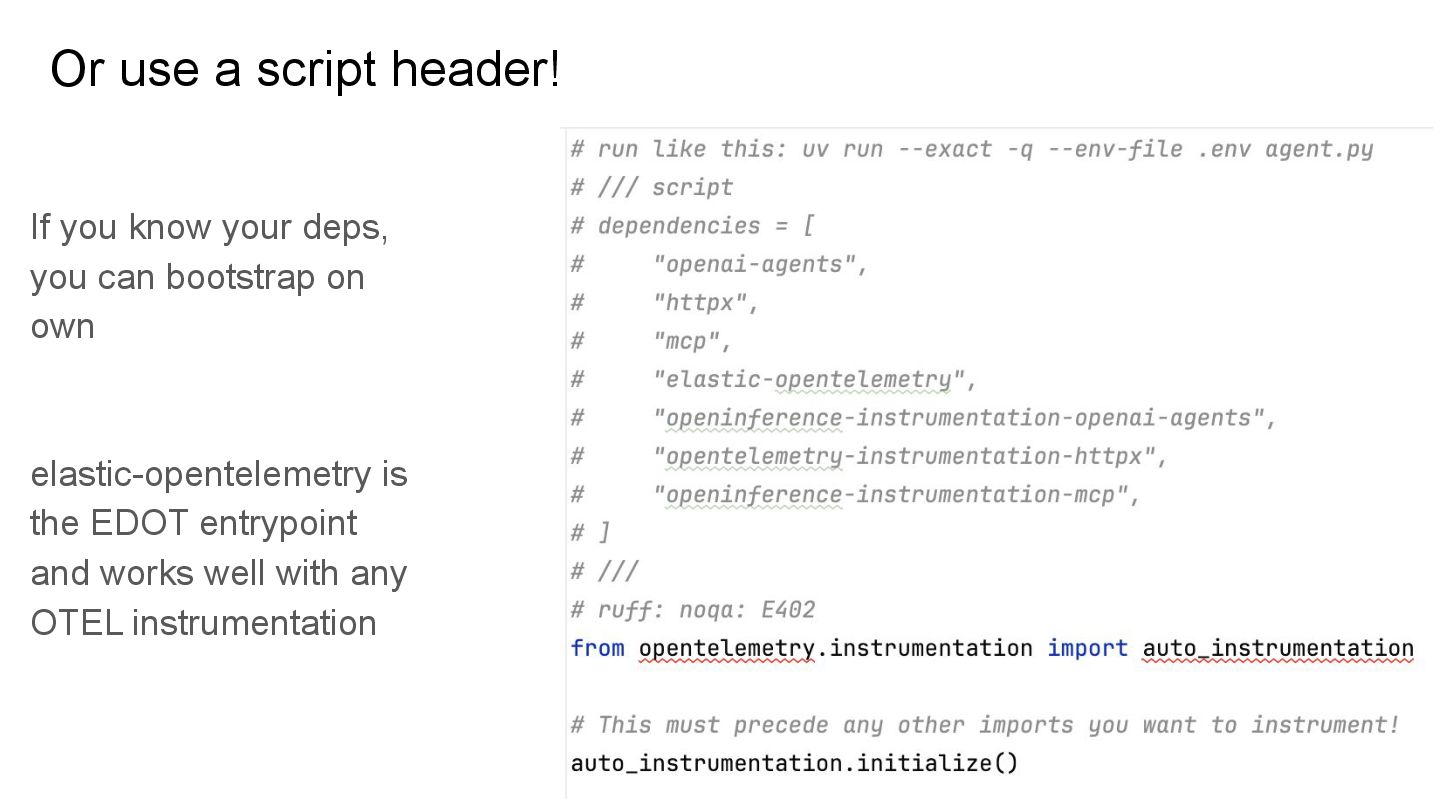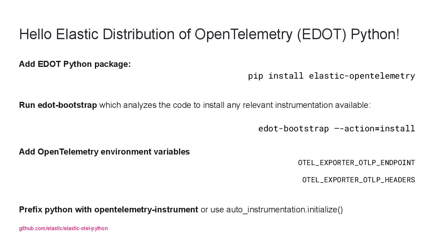 package: pip install elastic-opentelemetry Run edot-bootstrap which analyzes the code to install any relevant instrumentation available: edot-bootstrap —-action=install Add OpenTelemetry environment variables OTEL_EXPORTER_OTLP_ENDPOINT OTEL_EXPORTER_OTLP_HEADERS Prefix python with opentelemetry-instrument or use auto_instrumentation.initialize() github.com/elastic/elastic-otel-python