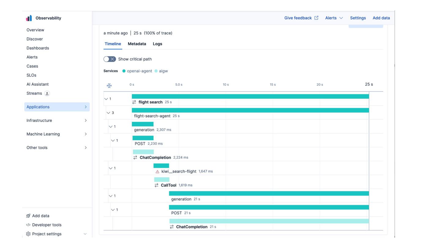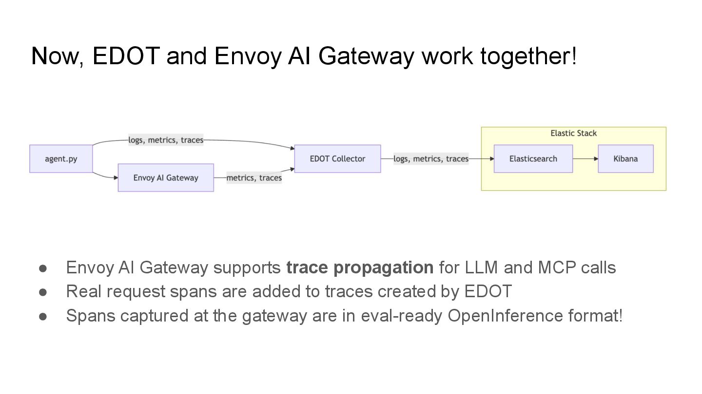 AI Gateway supports trace propagation for LLM and MCP calls • Real request spans are added to traces created by EDOT • Spans captured at the gateway are in eval-ready OpenInference format!