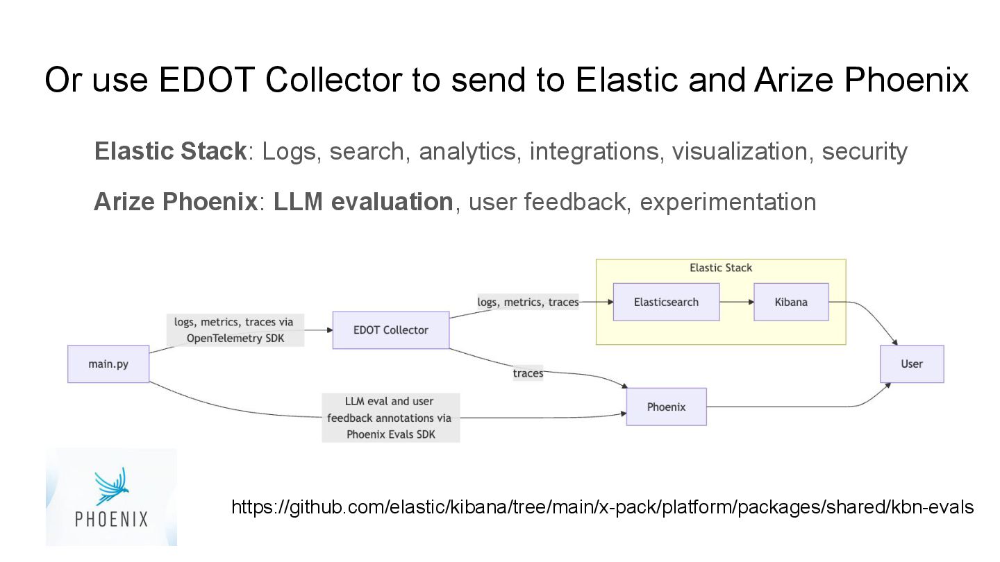 LLM evaluation, user feedback, experimentation Or use EDOT Collector to send to Elastic and Arize Phoenix https://github.com/elastic/kibana/tree/main/x-pack/platform/packages/shared/kbn-evals