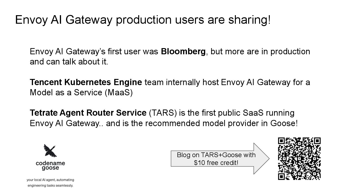 in production and can talk about it. Tencent Kubernetes Engine team internally host Envoy AI Gateway for a Model as a Service (MaaS) Tetrate Agent Router Service (TARS) is the first public SaaS running Envoy AI Gateway.. and is the recommended model provider in Goose! Blog on TARS+Goose with $10 free credit! Envoy AI Gateway production users are sharing!