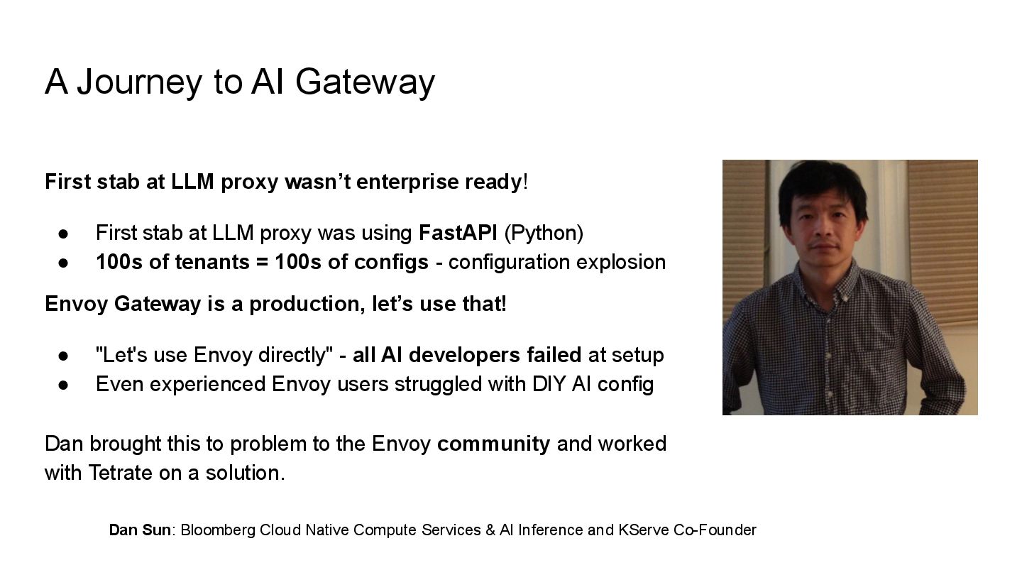 wasn’t enterprise ready! • First stab at LLM proxy was using FastAPI (Python) • 100s of tenants = 100s of configs - configuration explosion Envoy Gateway is a production, let’s use that! • "Let's use Envoy directly" - all AI developers failed at setup • Even experienced Envoy users struggled with DIY AI config Dan brought this to problem to the Envoy community and worked with Tetrate on a solution. Dan Sun: Bloomberg Cloud Native Compute Services & AI Inference and KServe Co-Founder