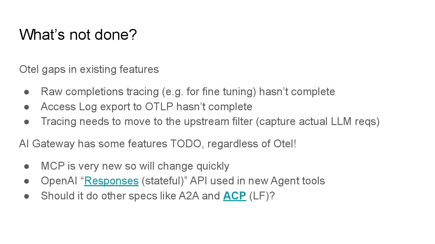 completions tracing (e.g. for fine tuning) hasn’t complete • Access Log export to OTLP hasn’t complete • Tracing needs to move to the upstream filter (capture actual LLM reqs) AI Gateway has some features TODO, regardless of Otel! • MCP is very new so will change quickly • OpenAI “Responses (stateful)” API used in new Agent tools • Should it do other specs like A2A and ACP (LF)?
