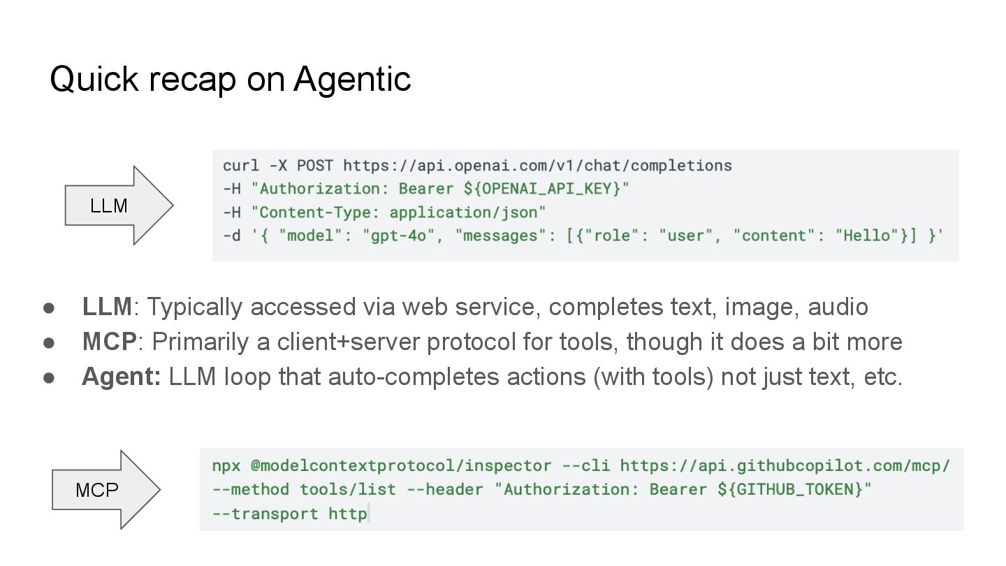 service, completes text, image, audio • MCP: Primarily a client+server protocol for tools, though it does a bit more • Agent: LLM loop that auto-completes actions (with tools) not just text, etc. LLM MCP