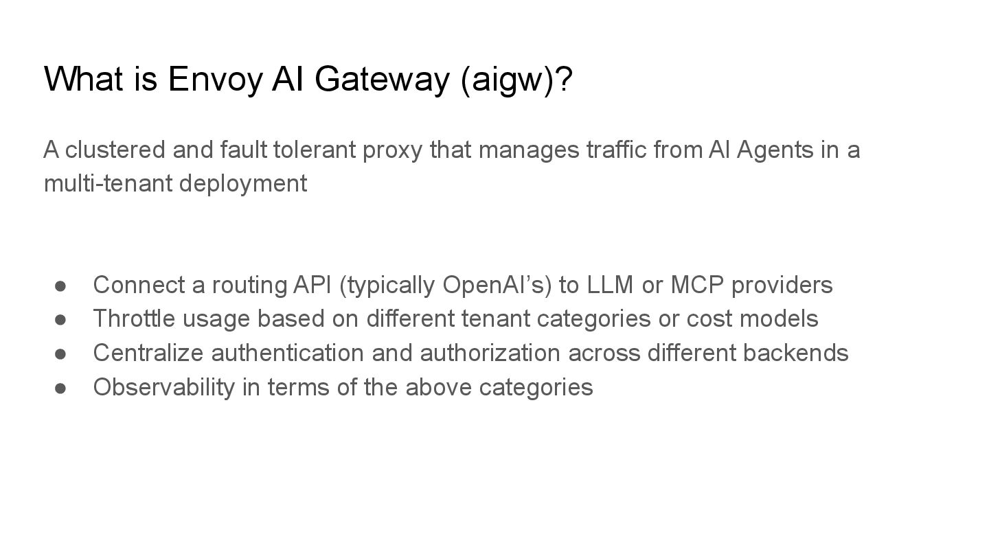 tolerant proxy that manages traffic from AI Agents in a multi-tenant deployment • Connect a routing API (typically OpenAI’s) to LLM or MCP providers • Throttle usage based on different tenant categories or cost models • Centralize authentication and authorization across different backends • Observability in terms of the above categories