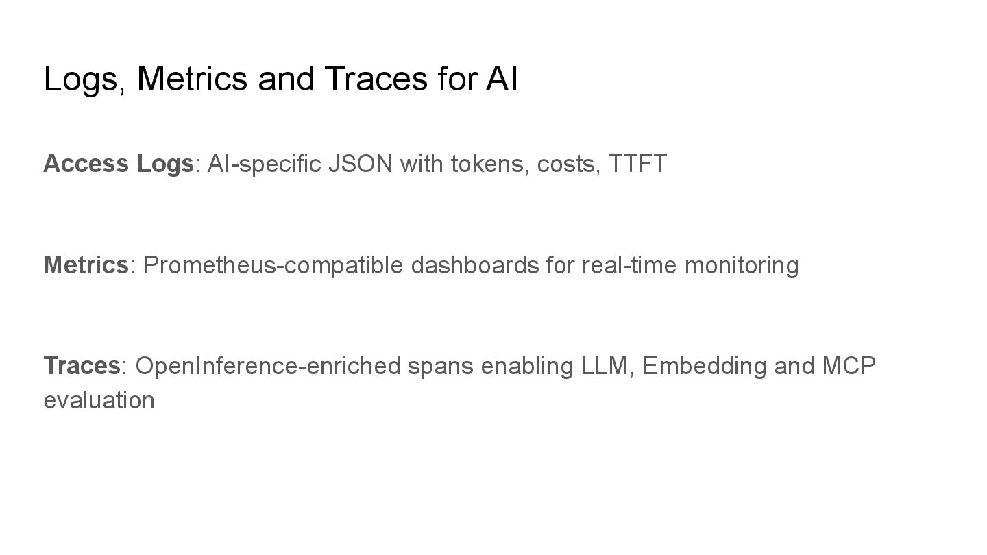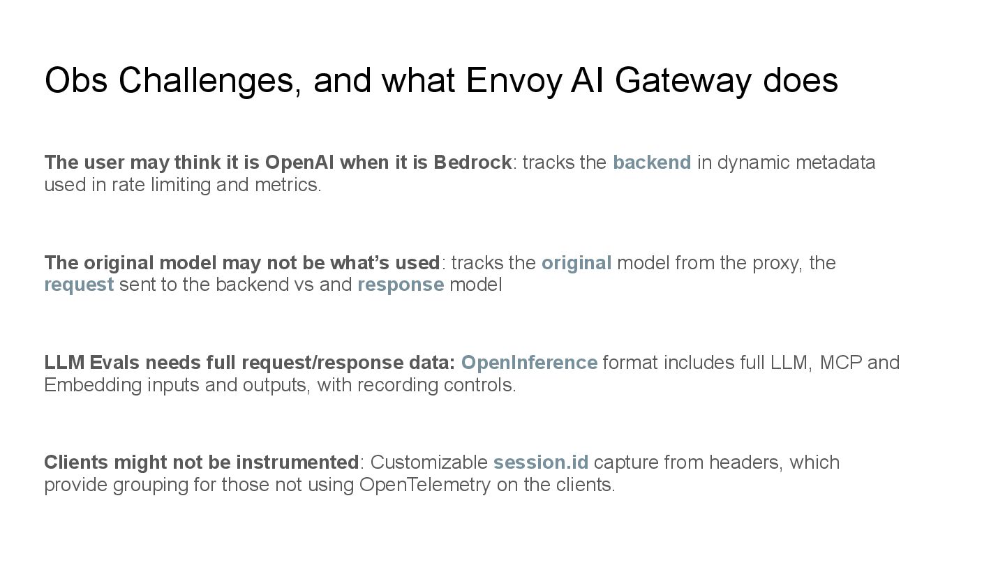 may think it is OpenAI when it is Bedrock: tracks the backend in dynamic metadata used in rate limiting and metrics. The original model may not be what’s used: tracks the original model from the proxy, the request sent to the backend vs and response model LLM Evals needs full request/response data: OpenInference format includes full LLM, MCP and Embedding inputs and outputs, with recording controls. Clients might not be instrumented: Customizable session.id capture from headers, which provide grouping for those not using OpenTelemetry on the clients.