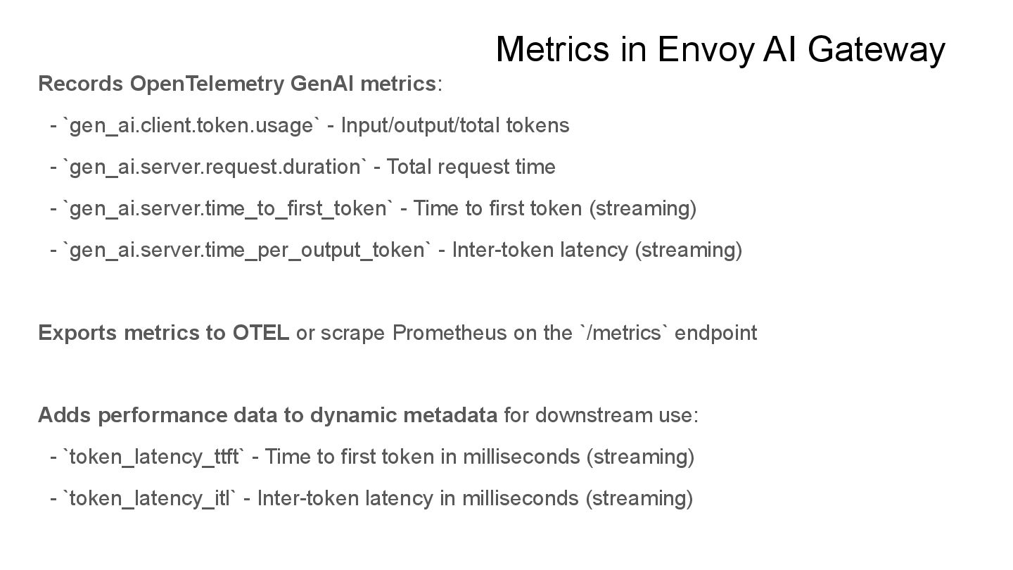 `gen_ai.server.request.duration` - Total request time - `gen_ai.server.time_to_first_token` - Time to first token (streaming) - `gen_ai.server.time_per_output_token` - Inter-token latency (streaming) Exports metrics to OTEL or scrape Prometheus on the `/metrics` endpoint Adds performance data to dynamic metadata for downstream use: - `token_latency_ttft` - Time to first token in milliseconds (streaming) - `token_latency_itl` - Inter-token latency in milliseconds (streaming) Metrics in Envoy AI Gateway