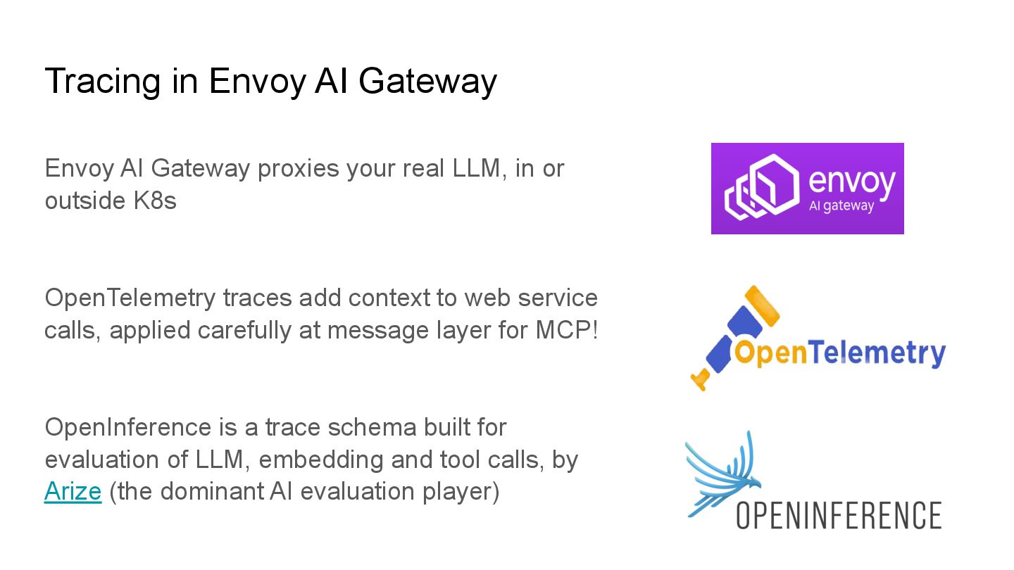 K8s OpenTelemetry traces add context to web service calls, applied carefully at message layer for MCP! OpenInference is a trace schema built for evaluation of LLM, embedding and tool calls, by Arize (the dominant AI evaluation player) Tracing in Envoy AI Gateway