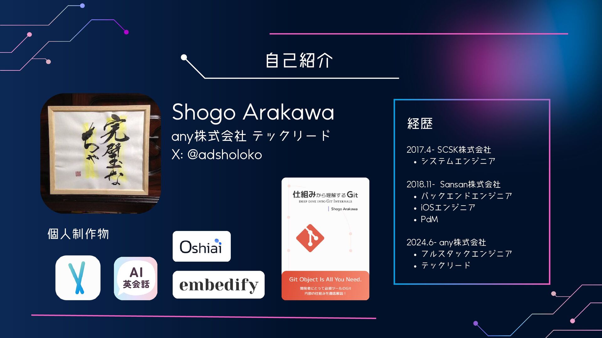 2024.6- any株式会社 フルスタックエンジニア テックリード Shogo Arakawa any株式会社 テックリード X: @adsholoko 個人制作物
