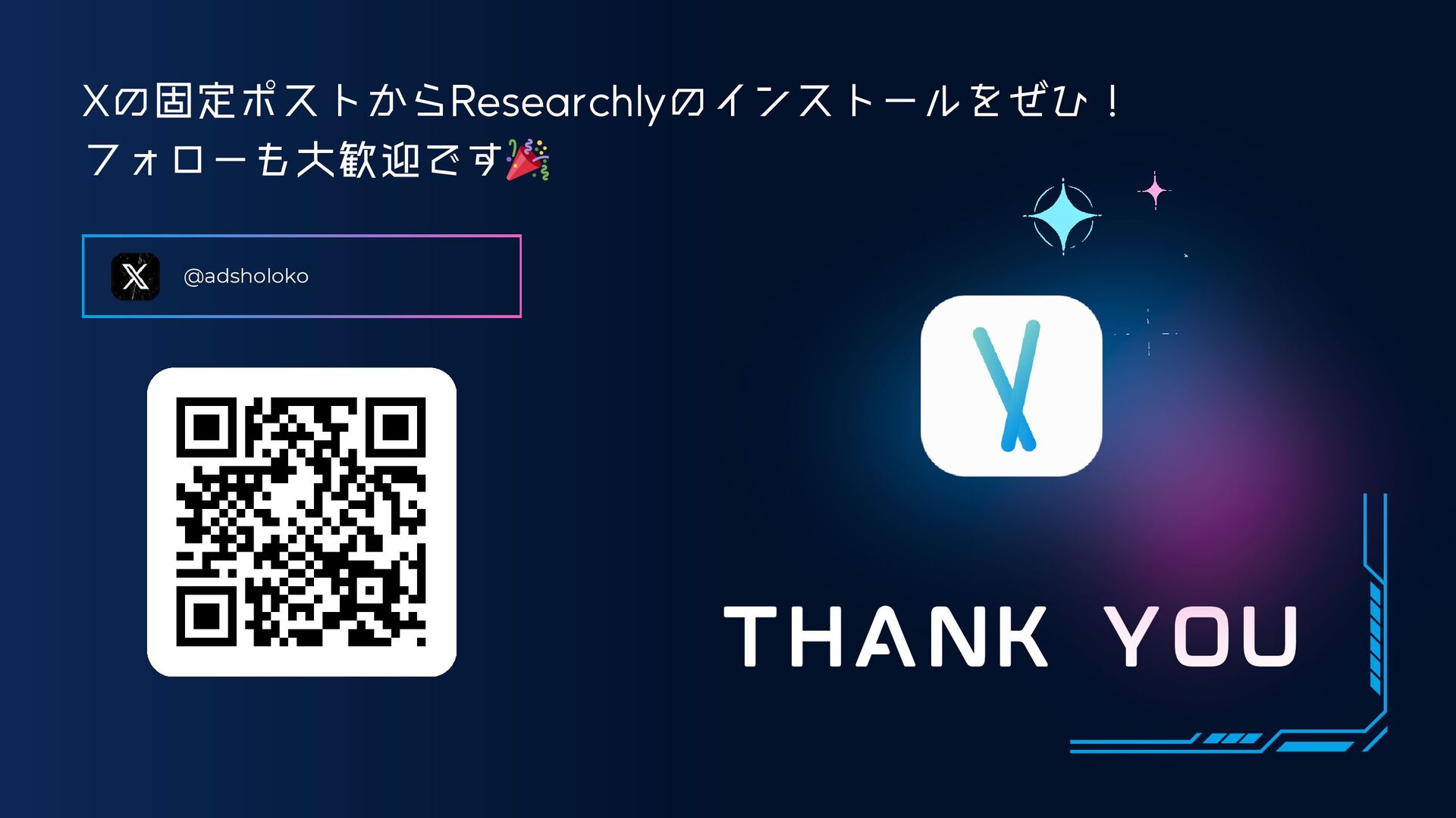 THANK YOU @adsholoko Xの固定ポストからResearchlyのインストールをぜひ! フォローも大歓迎です 🎉