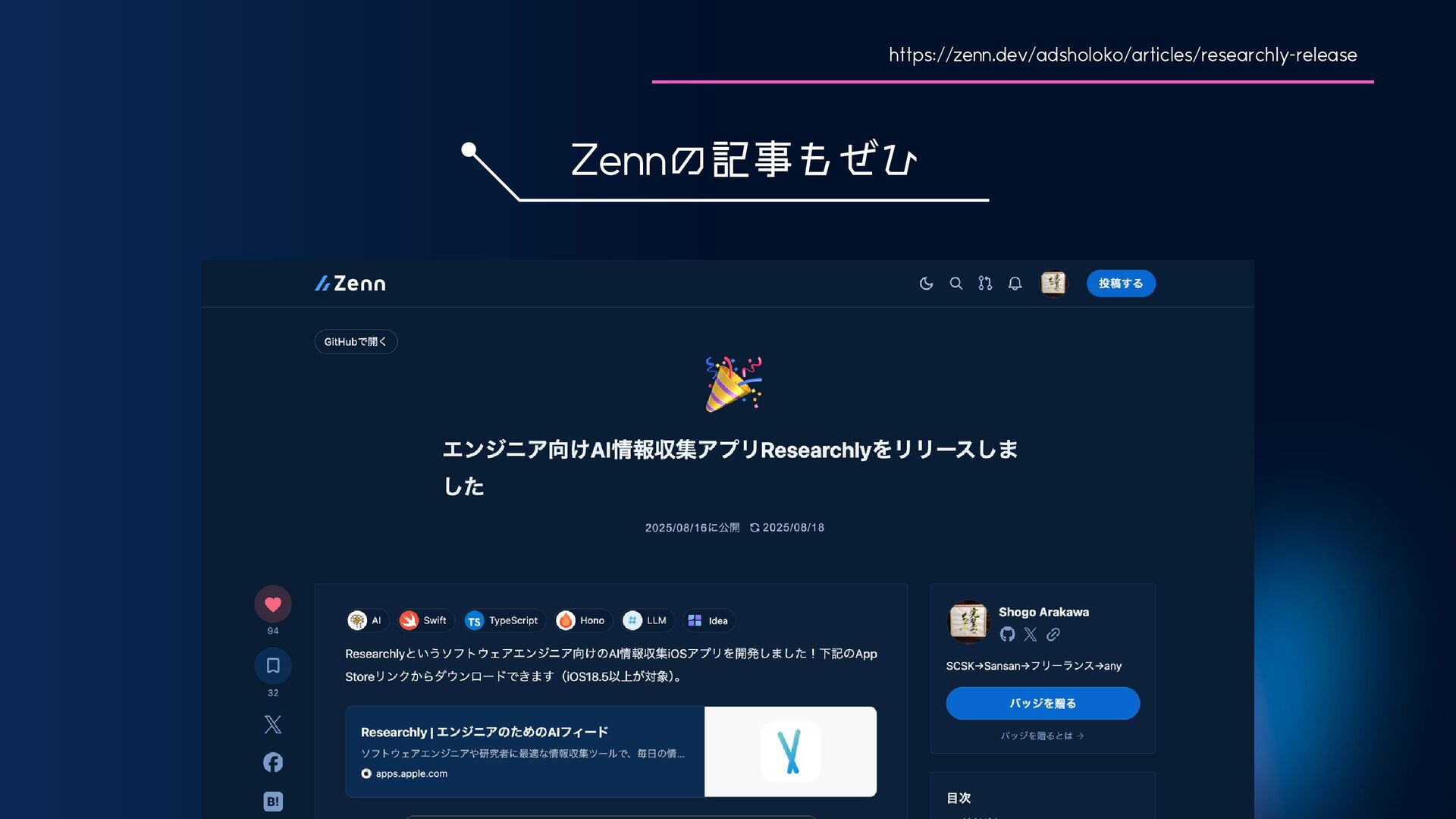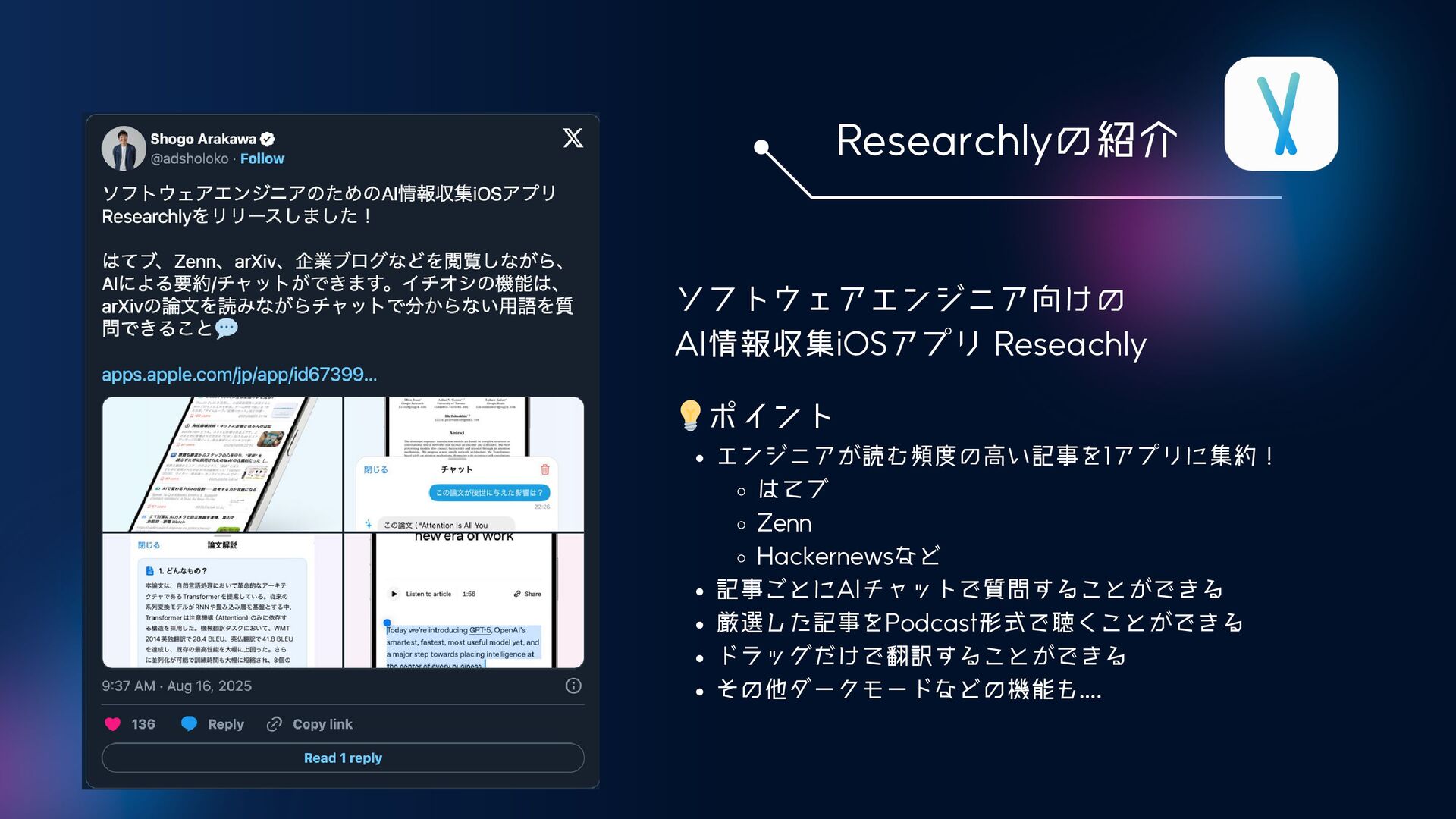 Zennの記事もぜひ https://zenn.dev/adsholoko/articles/researchly-release