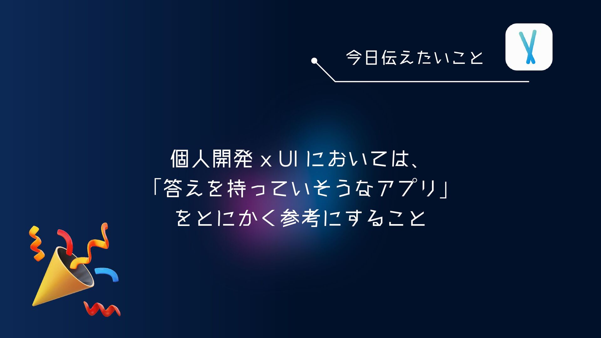 今日伝えたいこと 個人開発 x UI においては、 「答えを持っていそうなアプリ」 をとにかく参考にすること