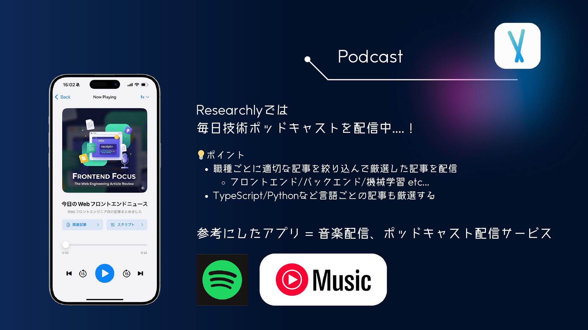 Researchlyでは 毎日技術ポッドキャストを配信中....! 💡ポイント 職種ごとに適切な記事を絞り込んで厳選した記事を配信 フロントエンド/バックエンド/機械学習 etc... TypeScript/Pythonなど言語ごとの記事も厳選する Podcast 参考にしたアプリ =