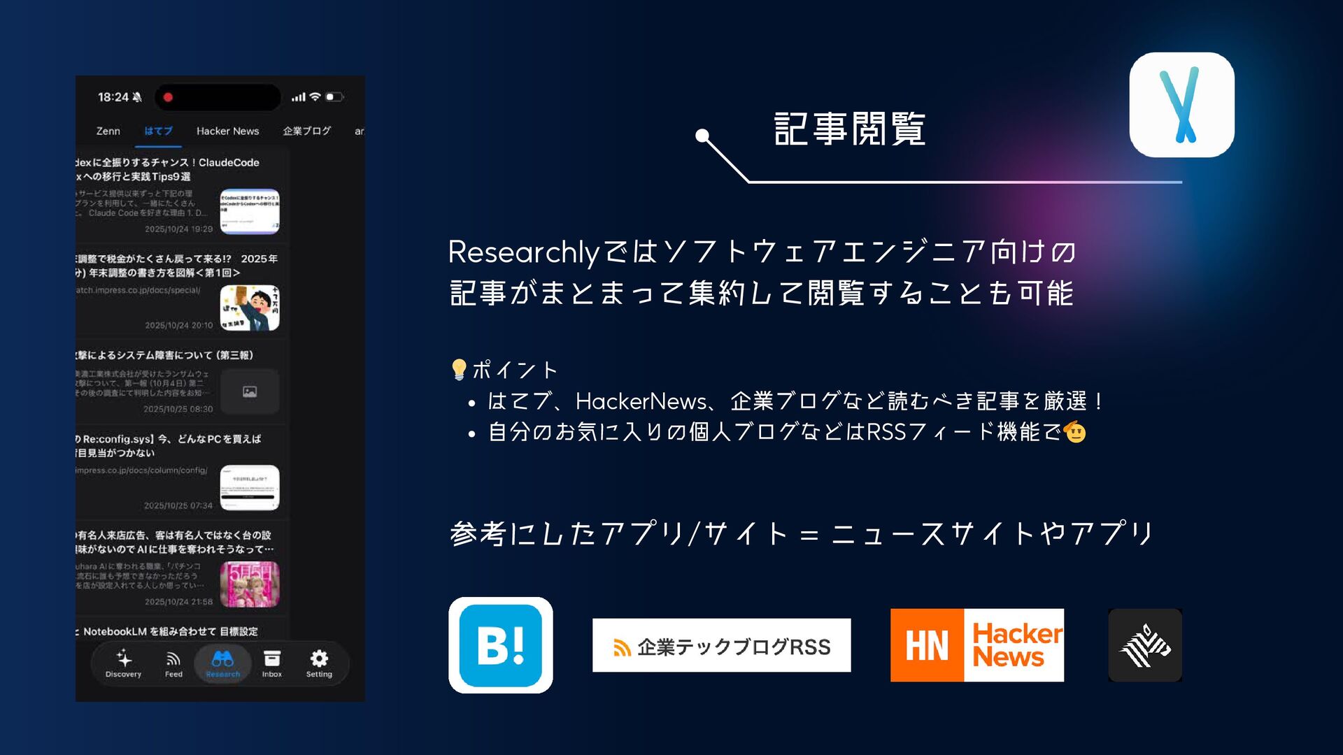 Researchlyの紹介 ソフトウェアエンジニア向けの AI情報収集iOSアプリ Reseachly 💡ポイント エンジニアが読む頻度の高い記事を1アプリに集約! はてブ Zenn Hackernewsなど 記事ごとにAIチャットで質問することができる