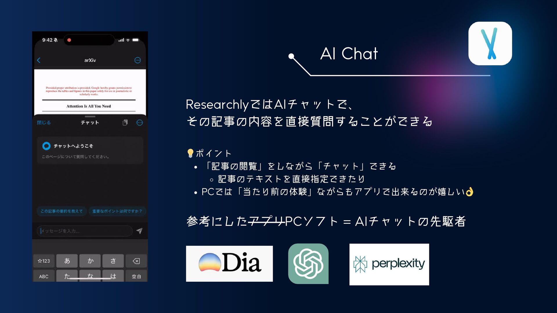 AI Chat 参考にしたアプリPCソフト = AIチャットの先駆者 ResearchlyではAIチャットで、 その記事の内容を直接質問することができる 💡ポイント 「記事の閲覧」をしながら「チャット」できる 記事のテキストを直接指定できたり