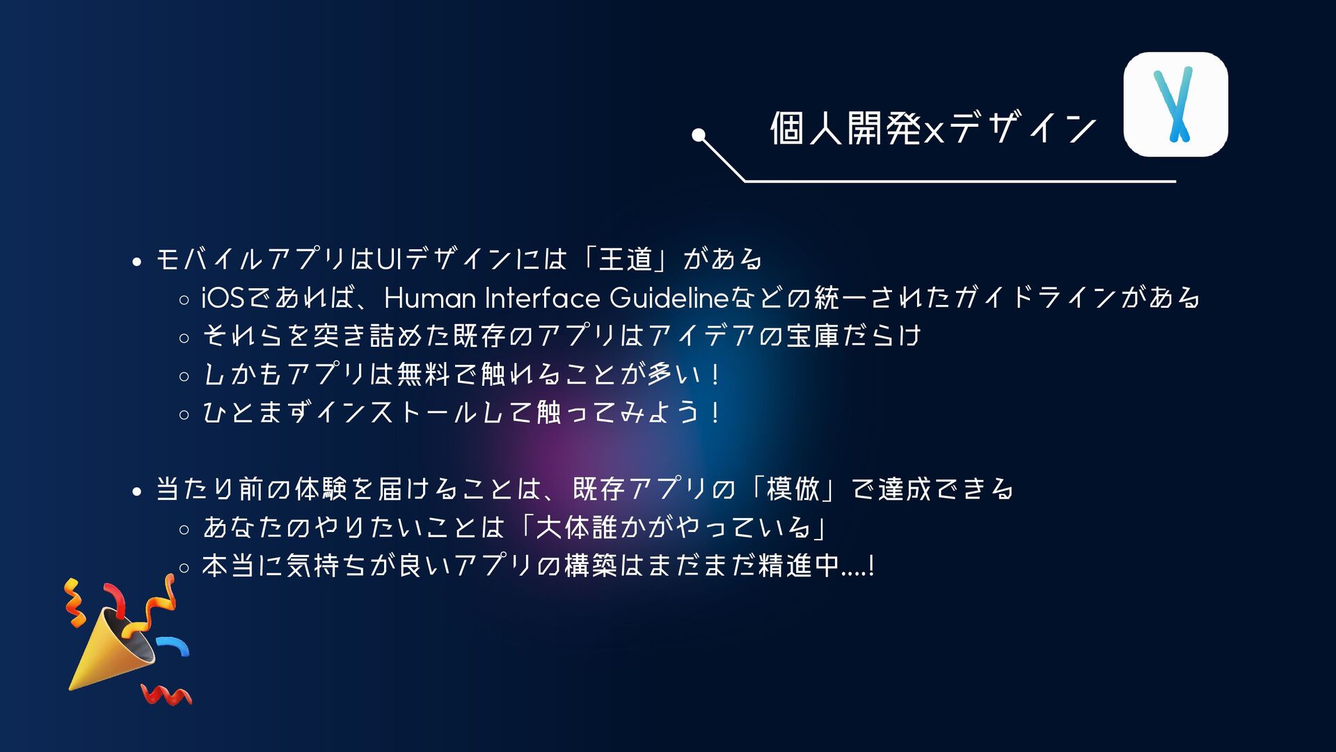 個人開発xデザイン モバイルアプリはUIデザインには「王道」がある iOSであれば、Human Interface Guidelineなどの統一されたガイドラインがある それらを突き詰めた既存のアプリはアイデアの宝庫だらけ しかもアプリは無料で触れることが多い! ひとまずインストールして触ってみよう! 当たり前の体験を届けることは、既存アプリの「模倣」で達成できる あなたのやりたいことは「大体誰かがやっている」