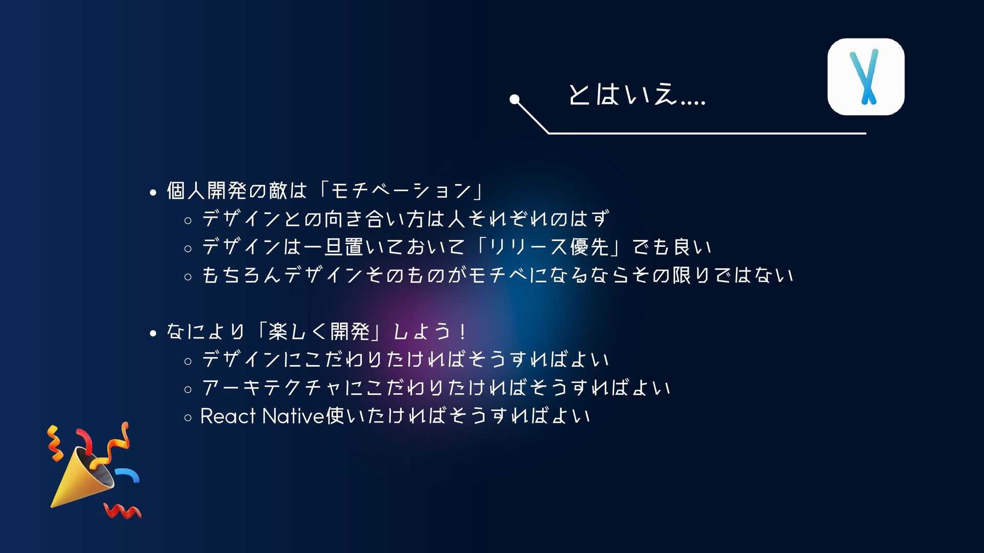 とはいえ.... 個人開発の敵は「モチベーション」 デザインとの向き合い方は人それぞれのはず デザインは一旦置いておいて「リリース優先」でも良い もちろんデザインそのものがモチベになるならその限りではない なにより「楽しく開発」しよう! デザインにこだわりたければそうすればよい アーキテクチャにこだわりたければそうすればよい React Native使いたければそうすればよい