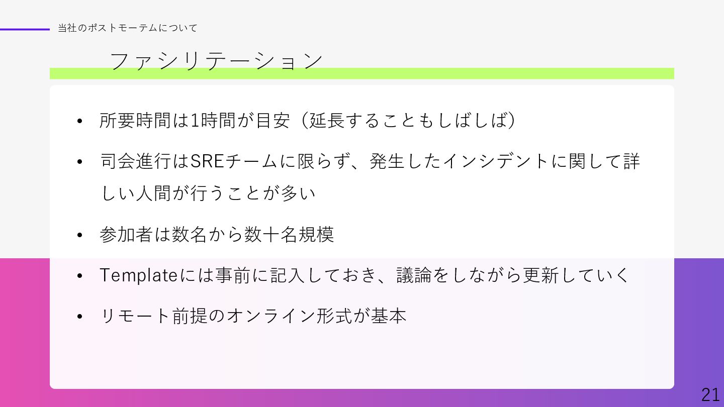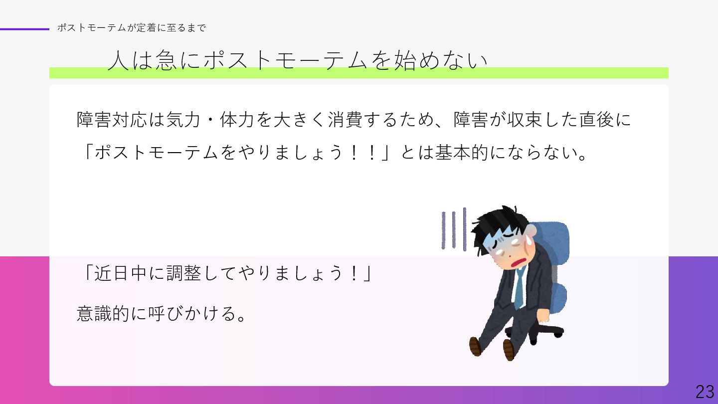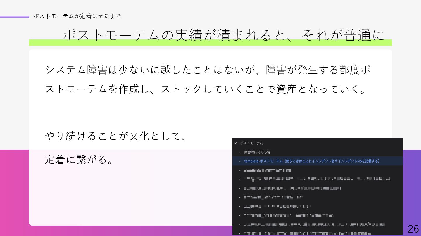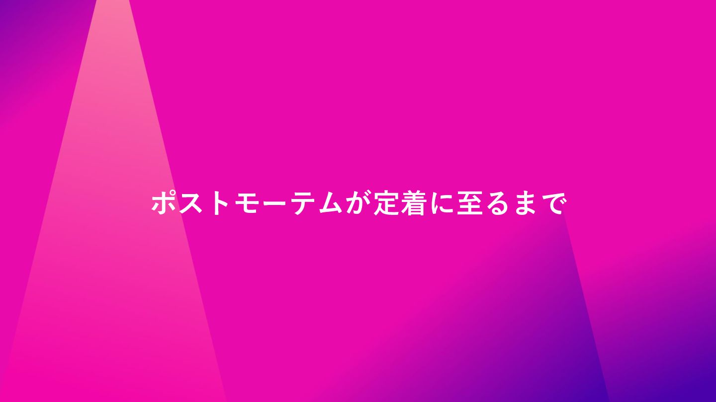 Findyさん主催イベント、「ポストモーテムを実践へ ─学びを組織に定着させるには─」での資料です。