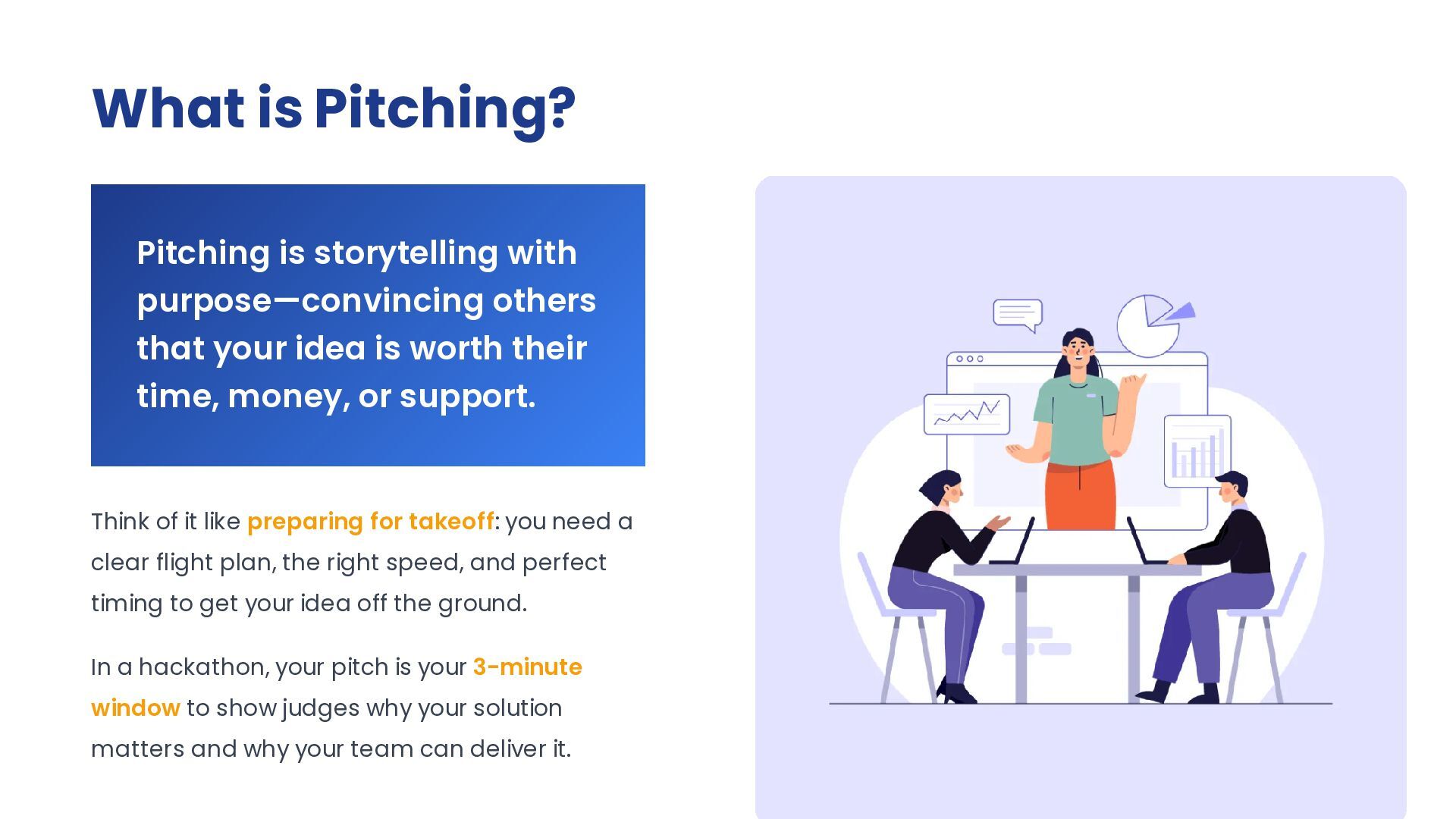 your idea is worth their time, money, or support. Think of it like preparing for takeoff: you need a clear flight plan, the right speed, and perfect timing to get your idea off the ground. In a hackathon, your pitch is your 3-minute window to show judges why your solution matters and why your team can deliver it.