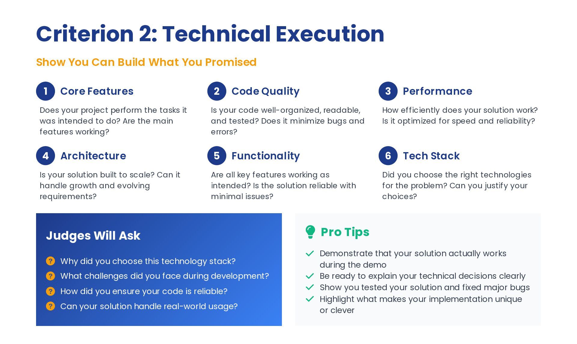 Promised 1 Core Features Does your project perform the tasks it was intended to do? Are the main features working? 2 Code Quality Is your code well-organized, readable, and tested? Does it minimize bugs and errors? 3 Performance How efficiently does your solution work? Is it optimized for speed and reliability? 4 Architecture Is your solution built to scale? Can it handle growth and evolving requirements? 5 Functionality Are all key features working as intended? Is the solution reliable with minimal issues? 6 Tech Stack Did you choose the right technologies for the problem? Can you justify your choices? Judges Will Ask Why did you choose this technology stack? What challenges did you face during development? How did you ensure your code is reliable? Can your solution handle real-world usage? Pro Tips Demonstrate that your solution actually works during the demo Be ready to explain your technical decisions clearly Show you tested your solution and fixed major bugs Highlight what makes your implementation unique or clever