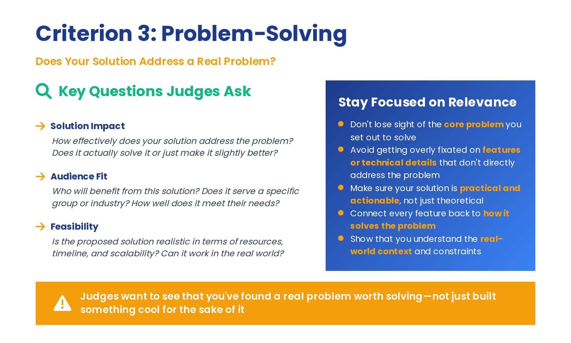 Key Questions Judges Ask Solution Impact How effectively does your solution address the problem? Does it actually solve it or just make it slightly better? Audience Fit Who will benefit from this solution? Does it serve a specific group or industry? How well does it meet their needs? Feasibility Is the proposed solution realistic in terms of resources, timeline, and scalability? Can it work in the real world? Stay Focused on Relevance Don't lose sight of the core problem you set out to solve Avoid getting overly fixated on features or technical details that don't directly address the problem Make sure your solution is practical and actionable, not just theoretical Connect every feature back to how it solves the problem Show that you understand the real- world context and constraints Judges want to see that you've found a real problem worth solving—not just built something cool for the sake of it