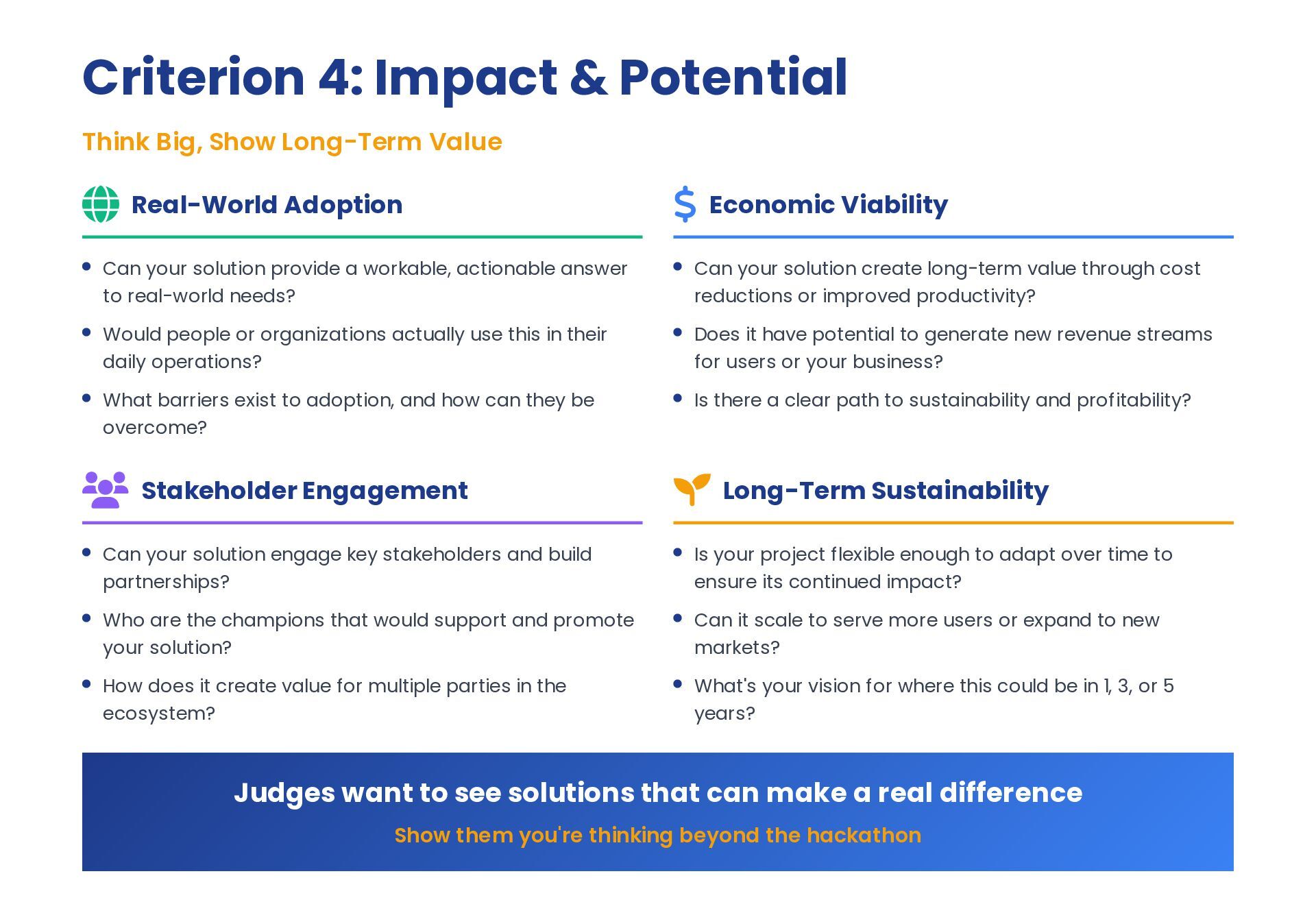 Real-World Adoption Can your solution provide a workable, actionable answer to real-world needs? Would people or organizations actually use this in their daily operations? What barriers exist to adoption, and how can they be overcome? $ Economic Viability Can your solution create long-term value through cost reductions or improved productivity? Does it have potential to generate new revenue streams for users or your business? Is there a clear path to sustainability and profitability? Stakeholder Engagement Can your solution engage key stakeholders and build partnerships? Who are the champions that would support and promote your solution? How does it create value for multiple parties in the ecosystem? Long-Term Sustainability Is your project flexible enough to adapt over time to ensure its continued impact? Can it scale to serve more users or expand to new markets? What's your vision for where this could be in 1, 3, or 5 years? Judges want to see solutions that can make a real difference Show them you're thinking beyond the hackathon