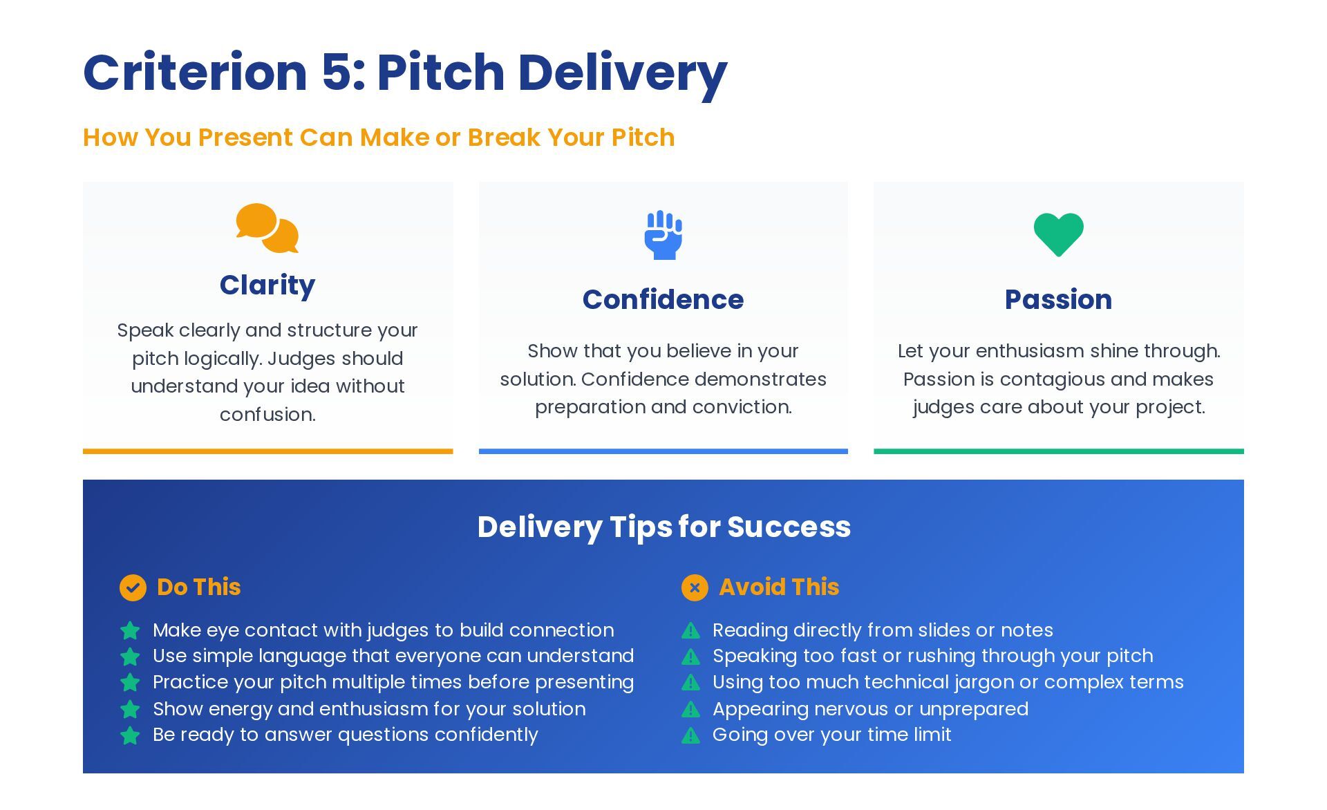 Break Your Pitch Clarity Speak clearly and structure your pitch logically. Judges should understand your idea without confusion. Confidence Show that you believe in your solution. Confidence demonstrates preparation and conviction. Passion Let your enthusiasm shine through. Passion is contagious and makes judges care about your project. Delivery Tips for Success Do This Make eye contact with judges to build connection Use simple language that everyone can understand Practice your pitch multiple times before presenting Show energy and enthusiasm for your solution Be ready to answer questions confidently Avoid This Reading directly from slides or notes Speaking too fast or rushing through your pitch Using too much technical jargon or complex terms Appearing nervous or unprepared Going over your time limit