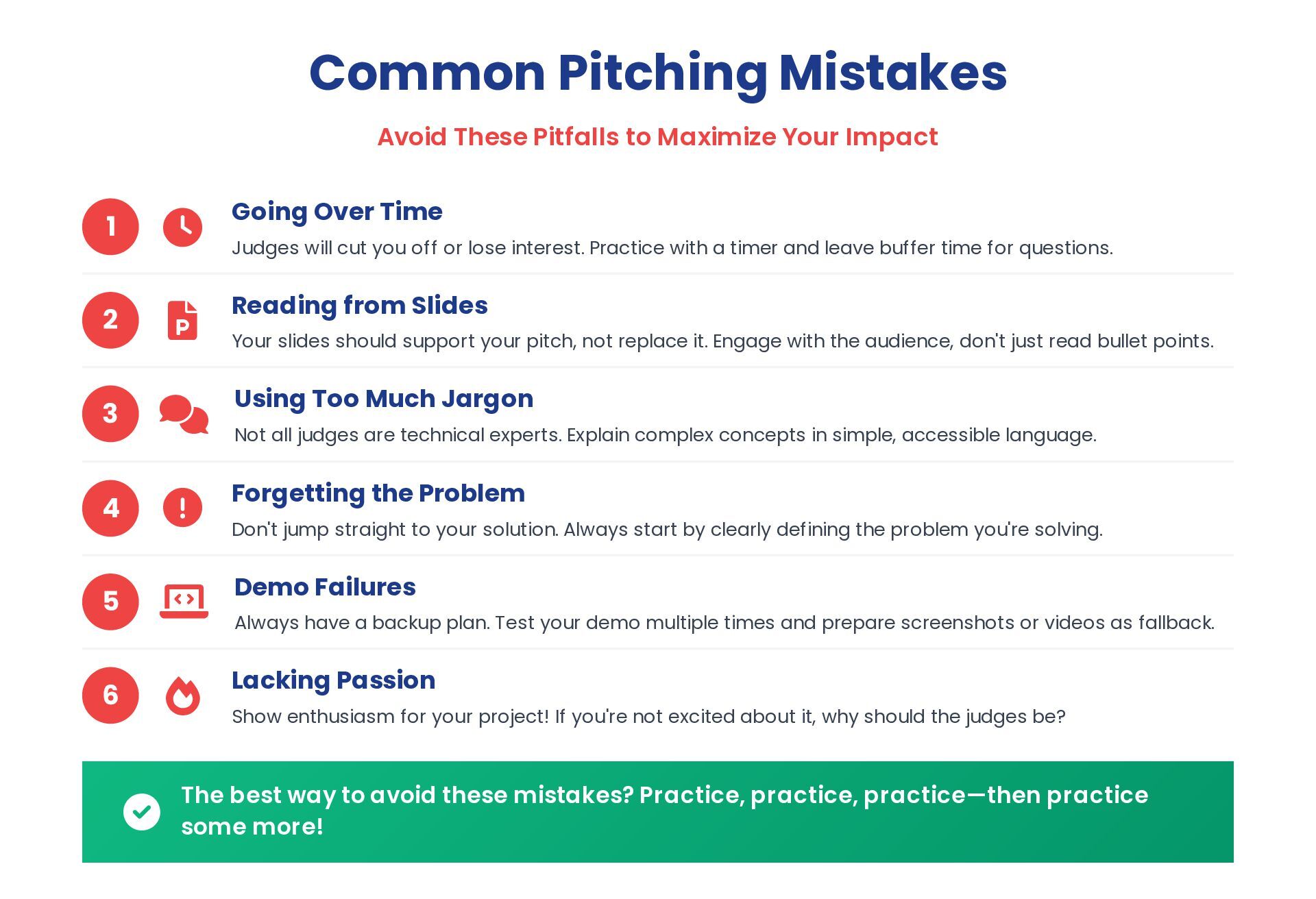 1 Going Over Time Judges will cut you off or lose interest. Practice with a timer and leave buffer time for questions. 2 Reading from Slides Your slides should support your pitch, not replace it. Engage with the audience, don't just read bullet points. 3 Using Too Much Jargon Not all judges are technical experts. Explain complex concepts in simple, accessible language. 4 Forgetting the Problem Don't jump straight to your solution. Always start by clearly defining the problem you're solving. 5 Demo Failures Always have a backup plan. Test your demo multiple times and prepare screenshots or videos as fallback. 6 Lacking Passion Show enthusiasm for your project! If you're not excited about it, why should the judges be? The best way to avoid these mistakes? Practice, practice, practice—then practice some more!