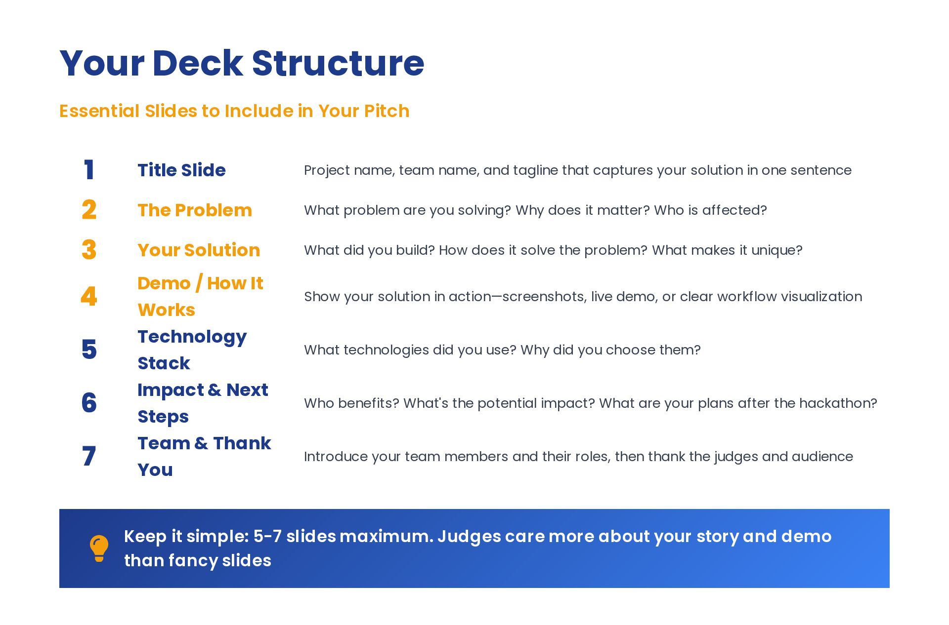1 Title Slide Project name, team name, and tagline that captures your solution in one sentence 2 The Problem What problem are you solving? Why does it matter? Who is affected? 3 Your Solution What did you build? How does it solve the problem? What makes it unique? 4 Demo / How It Works Show your solution in action—screenshots, live demo, or clear workflow visualization 5 Technology Stack What technologies did you use? Why did you choose them? 6 Impact & Next Steps Who benefits? What's the potential impact? What are your plans after the hackathon? 7 Team & Thank You Introduce your team members and their roles, then thank the judges and audience Keep it simple: 5-7 slides maximum. Judges care more about your story and demo than fancy slides