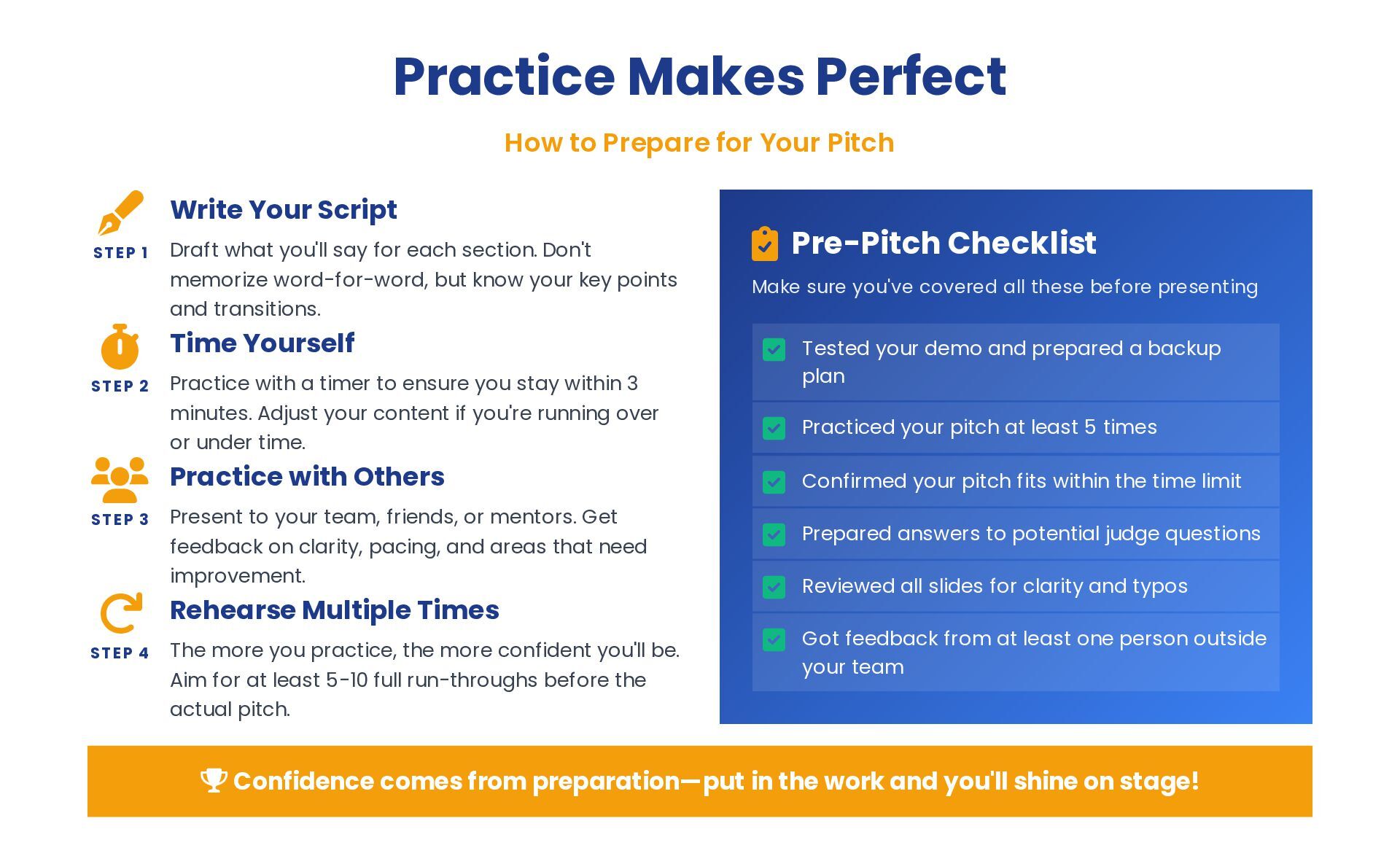 ST EP 1 Write Your Script Draft what you'll say for each section. Don't memorize word-for-word, but know your key points and transitions. ST EP 2 Time Yourself Practice with a timer to ensure you stay within 3 minutes. Adjust your content if you're running over or under time. ST EP 3 Practice with Others Present to your team, friends, or mentors. Get feedback on clarity, pacing, and areas that need improvement. ST EP 4 Rehearse Multiple Times The more you practice, the more confident you'll be. Aim for at least 5-10 full run-throughs before the actual pitch. Pre-Pitch Checklist Tested your demo and prepared a backup plan Practiced your pitch at least 5 times Confirmed your pitch fits within the time limit Prepared answers to potential judge questions Reviewed all slides for clarity and typos Got feedback from at least one person outside your team Confidence comes from preparation—put in the work and you'll shine on stage! Make sure you've covered all these before presenting